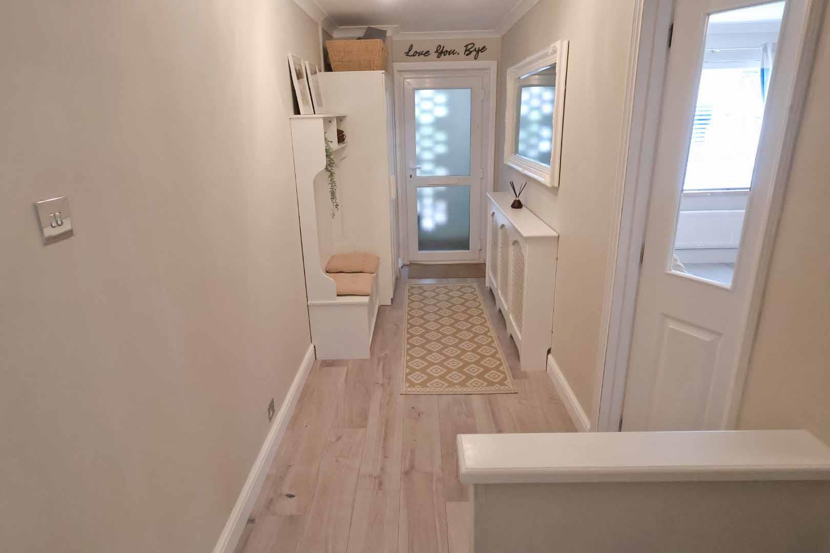 An inviting entrance hall with woodgrain-effect laminate flooring, a radiator, and stairs rising to the first-floor accommodation. Partially glazed doors open into the living room and kitchen