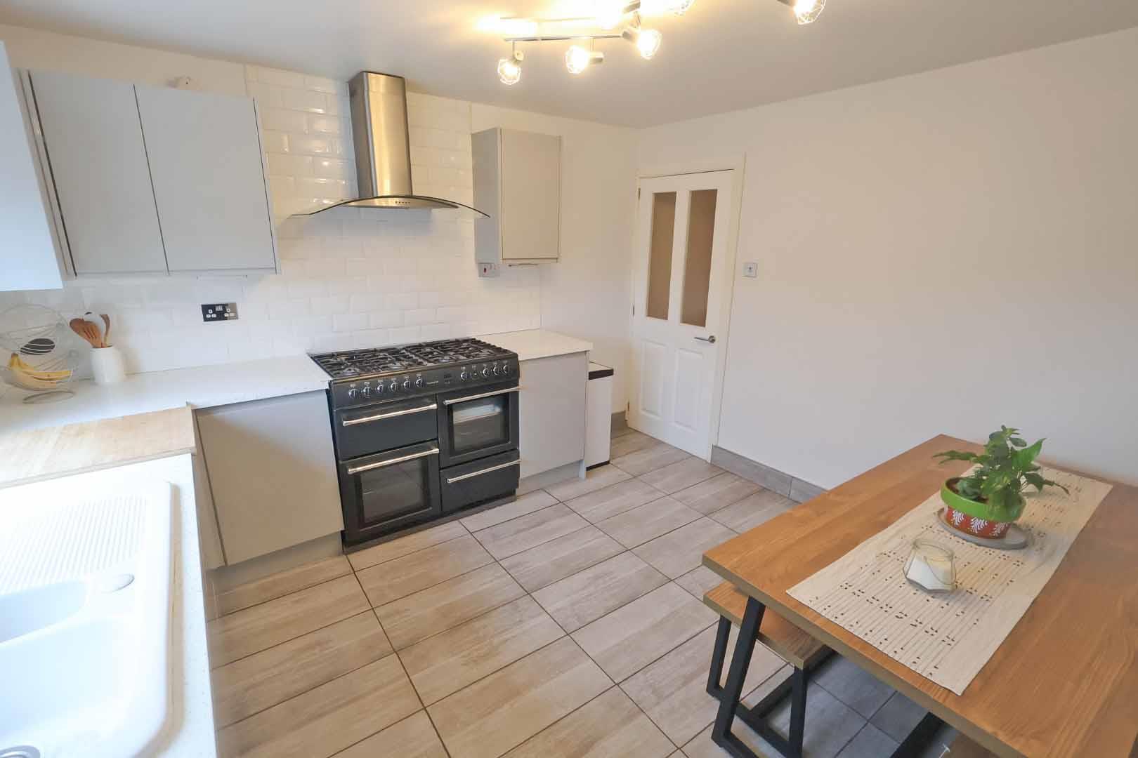 Fitted with a ceramic tiled floor and a range of contemporary gloss grey wall and base units with complementary work surface space, incorporating a ceramic one-and-a-half bowl sink unit with mixer tap. There is space for a range cooker with a stainless steel and glass canopy extractor hood above and tiled splashback. A window faces the rear elevation, and an opaque partially glazed door opens into the utility room.