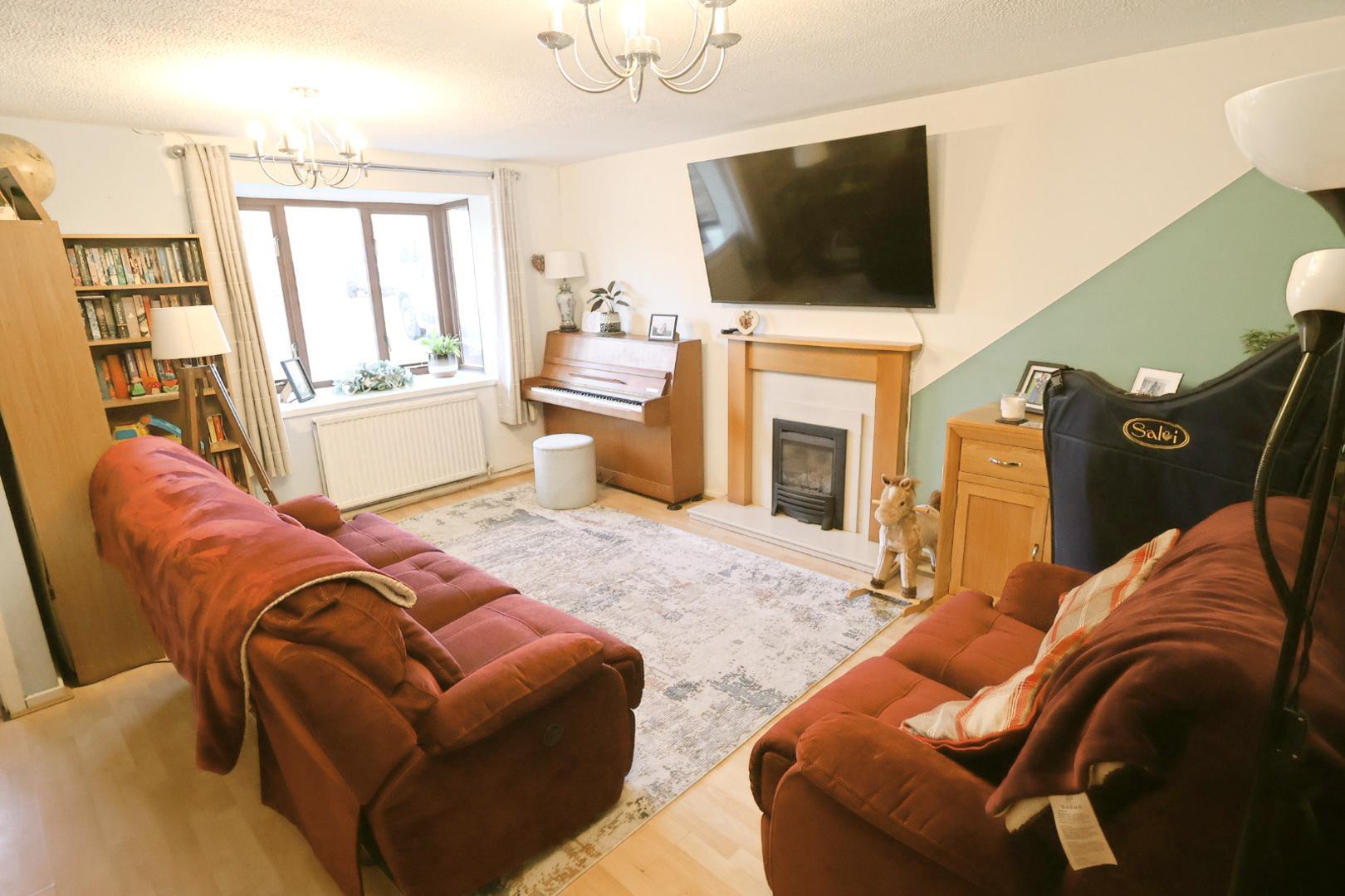 With a continuation of the wood grain–effect laminate flooring from the vestibule, the living area includes a bow window to the front elevation, a radiator, and a marble hearth with an Adam-style surround housing a living flame gas fire. Stairs rise to the first-floor accommodation, and an open throughway leads to the dining area, which also has a radiator, an arched opening to the kitchen, and patio doors opening into the conservatory.