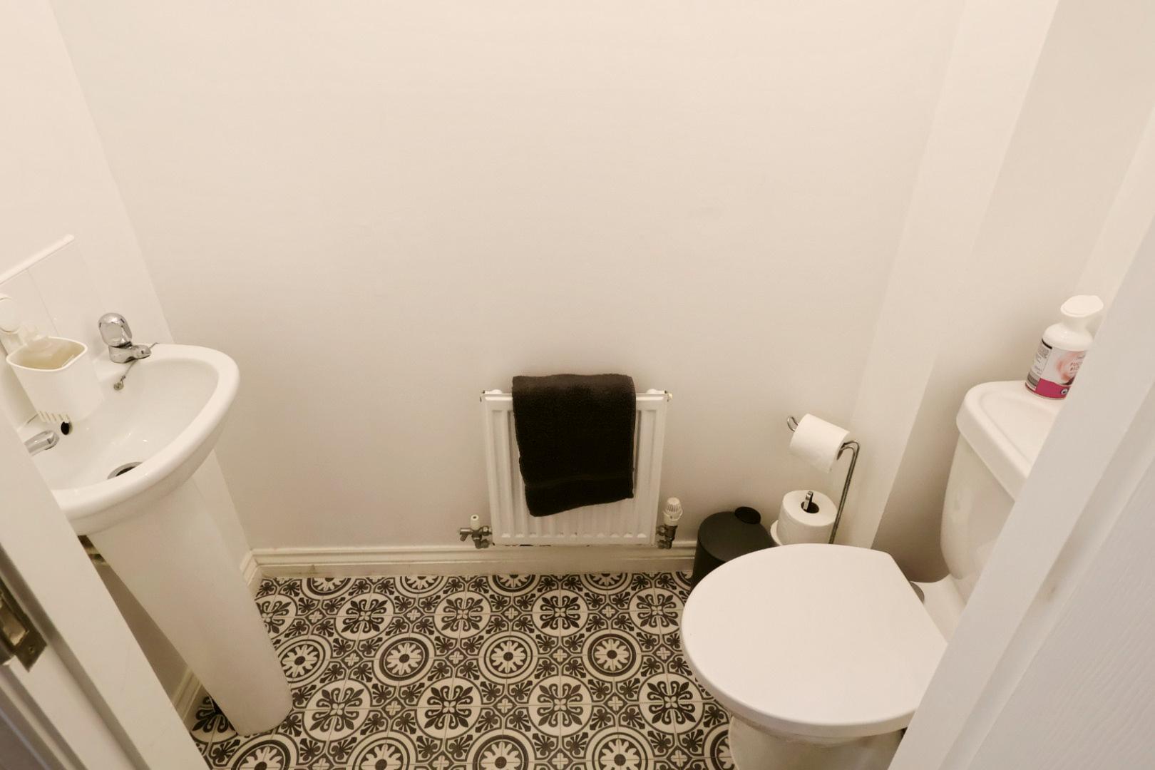 Fitted with a dual-flush low-level WC and pedestal wash hand basin, with radiator and ceiling-mounted extractor fan.