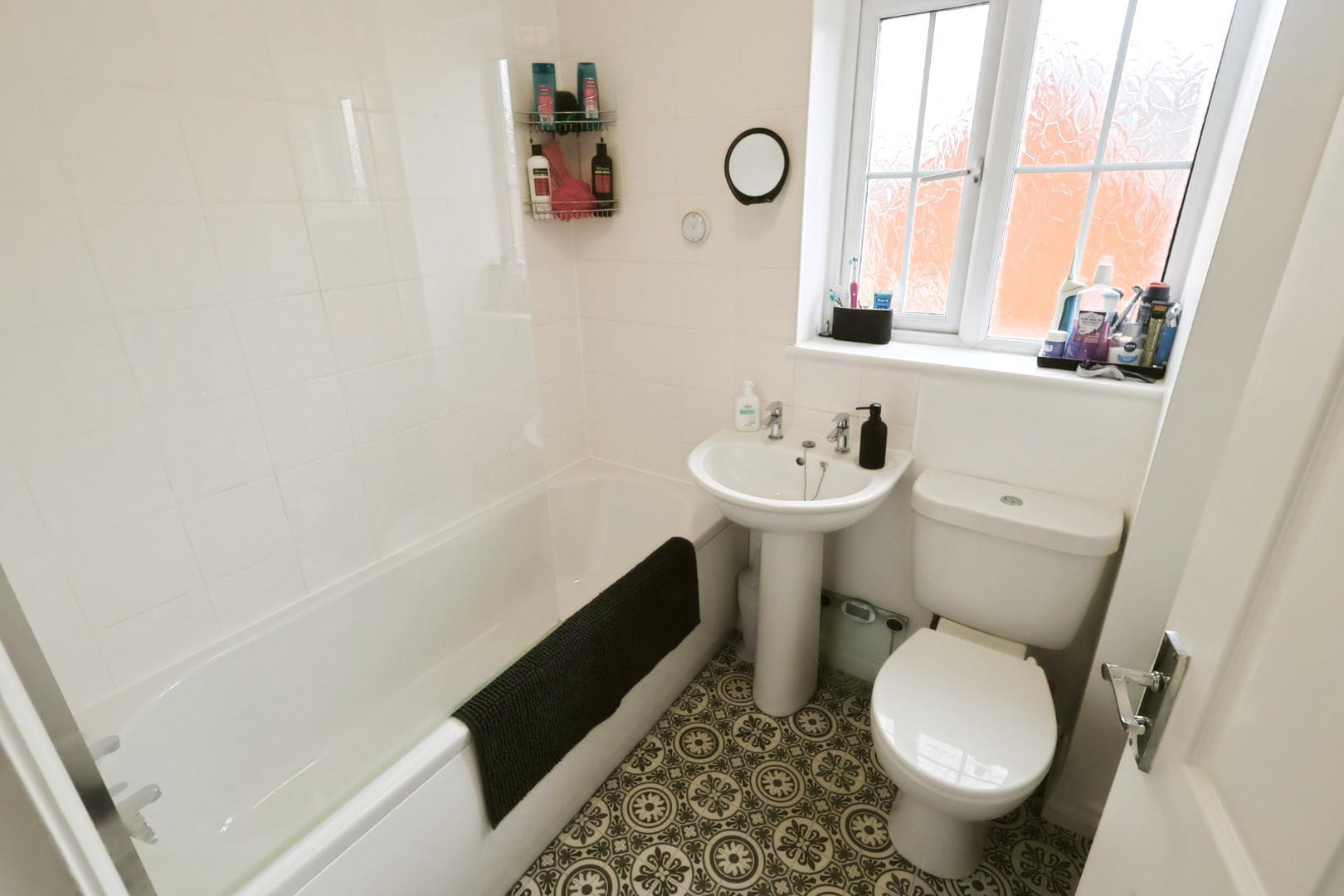Installed with a modern three-piece white suite comprising a panelled bath with thermostatic shower and protective screen, dual-flush low-level WC, and pedestal wash hand basin. The walls are partially tiled, with radiator, opaque front-facing window, and ceiling-mounted extractor fan.