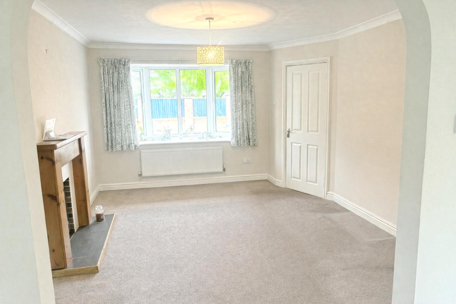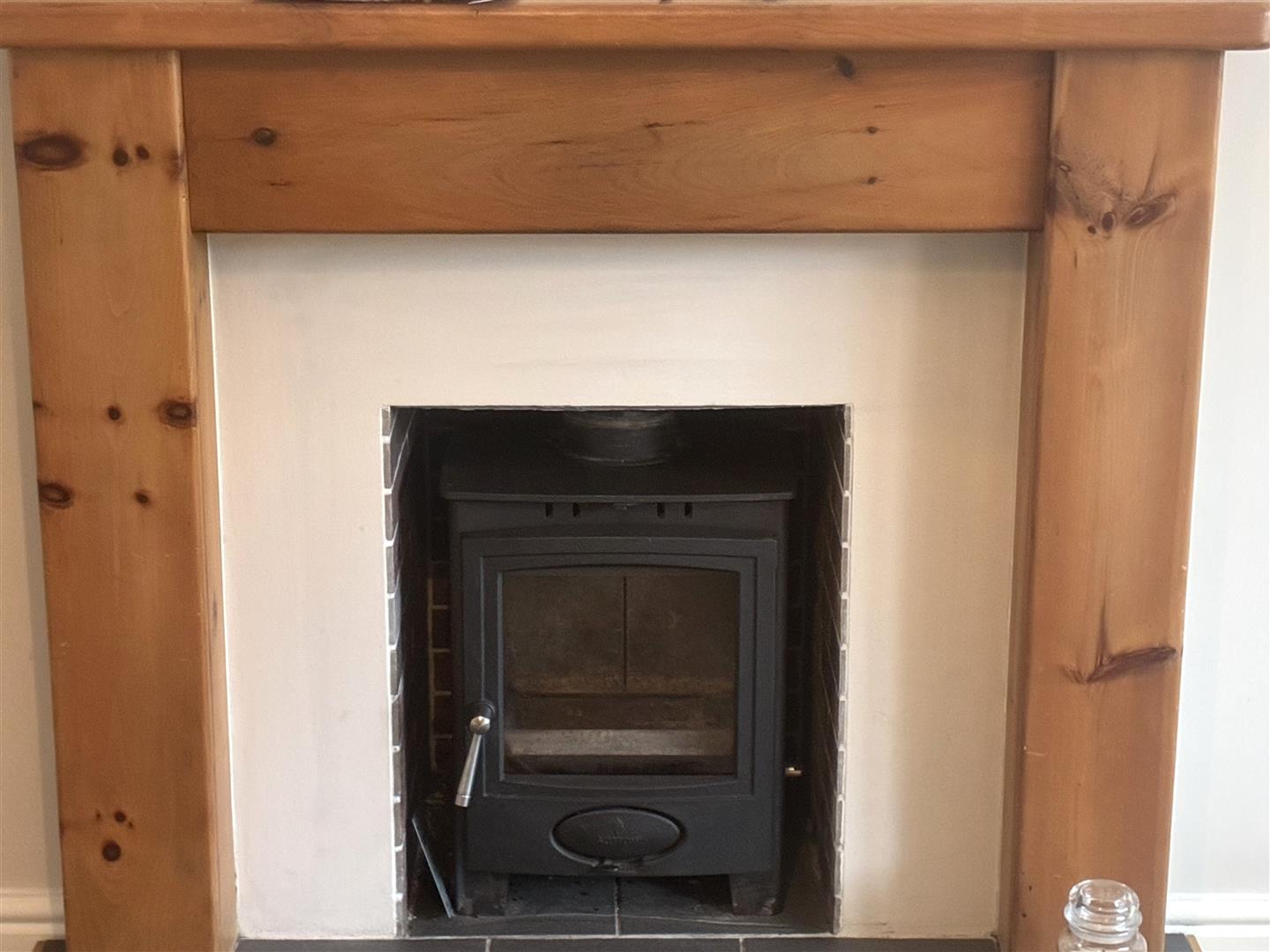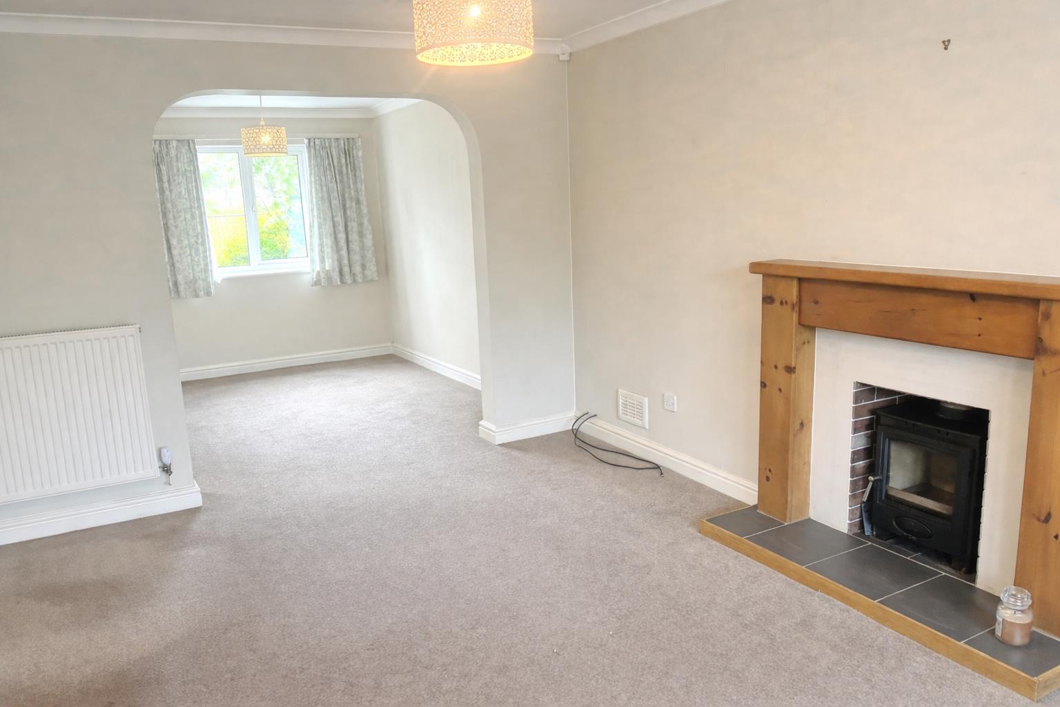 Featuring a bay window to the front elevation, a radiator, and an understairs storage cupboard. An arched opening leads through to the dining room. The room also features a cast iron dual-fuel burner set on a tiled hearth with a pine Adam-style surround.