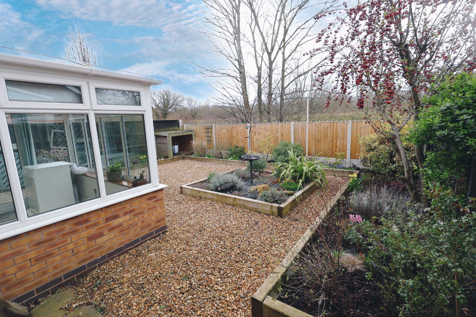 To the front of the property is off-road parking for several vehicles, alongside a golden gravel and shrub garden. Timber side access leads to the rear garden, and there is an external light by the front door. An attractive and well-landscaped rear garden featuring a paved patio area, a golden gravel section, and sleeper-raised beds planted with a variety of shrubs and trees. The garden is enclosed by concrete posts and timber fence panels and benefits from external lighting and a water supply.