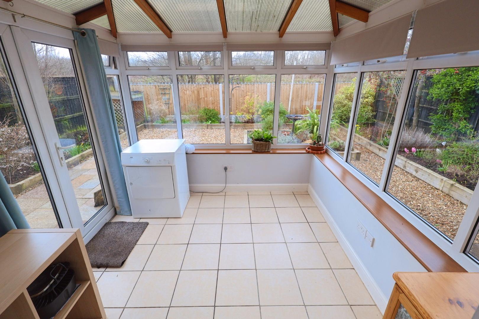 Fitted with a ceramic tiled floor, a radiator, a window to the rear elevation, and patio doors opening to the conservatory. The kitchen comprises a range of light oak-style wall, base, and drawer units, complemented by stainless steel handles and granite work surfaces. There is a stainless steel one-and-a-half bowl sink unit with mixer tap, space for a range cooker with stainless steel extractor hood above, space and plumbing for a washing machine, and an integrated slimline dishwasher.