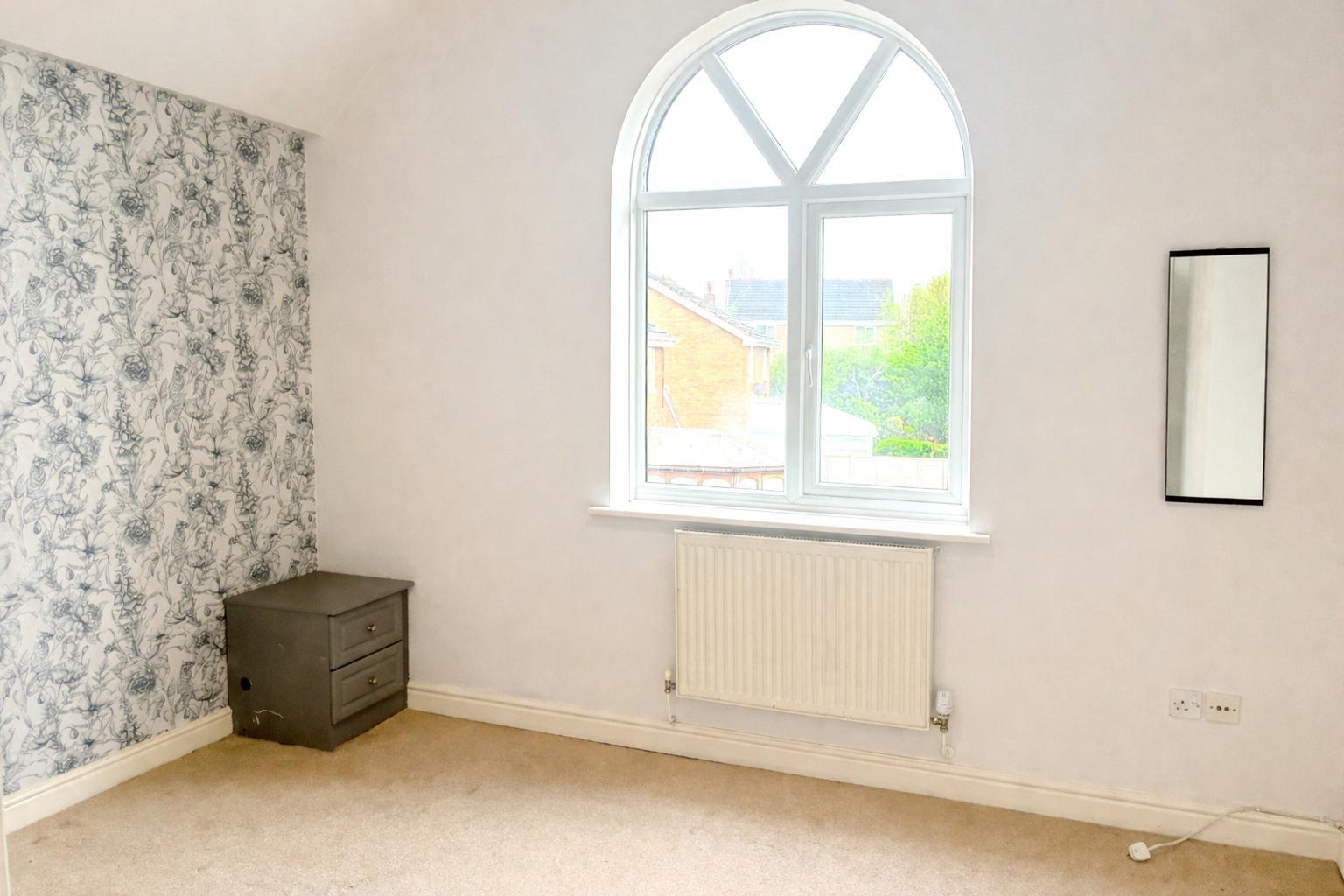 The principal bedroom features a built-in double wardrobe, a feature arched window to the front elevation with a radiator below, and a door leading to the en-suite shower room.