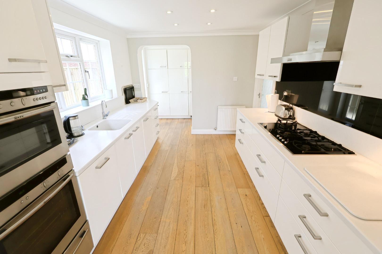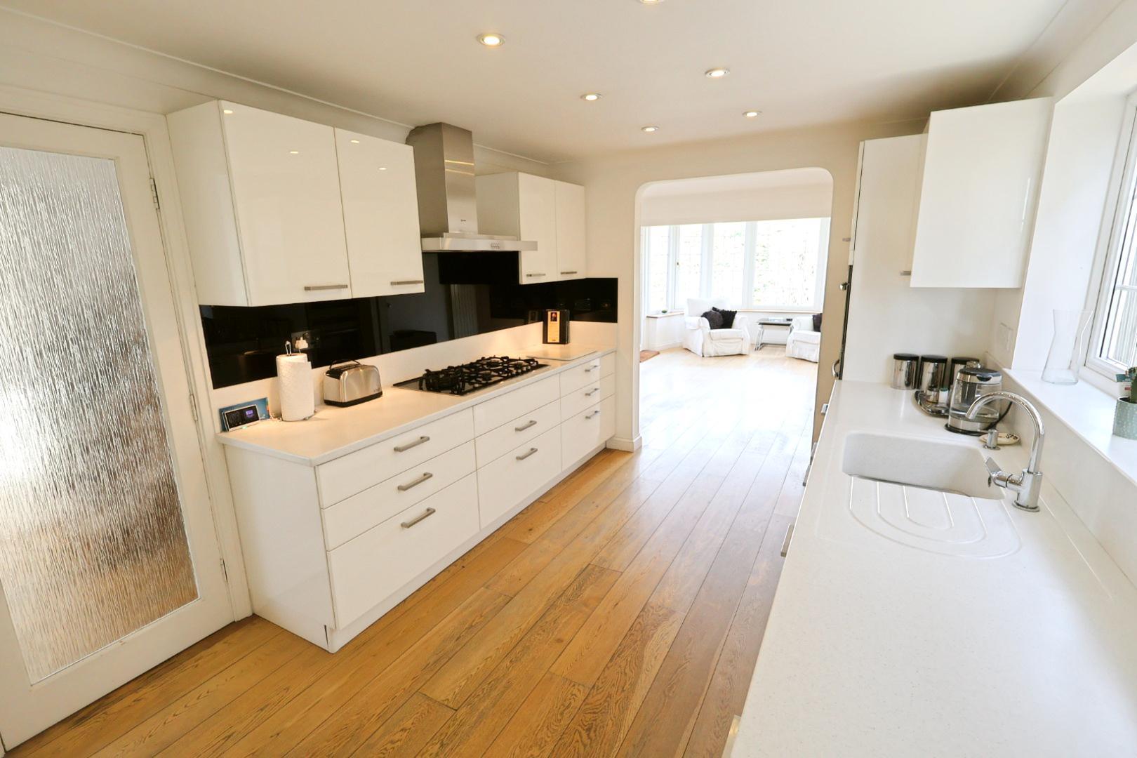 With continued engineered oak flooring, recessed downlights, and an opaque uPVC double-glazed door to the side elevation. Fitted with matching gloss white units, including a larder cupboard and integrated fridge and freezer.