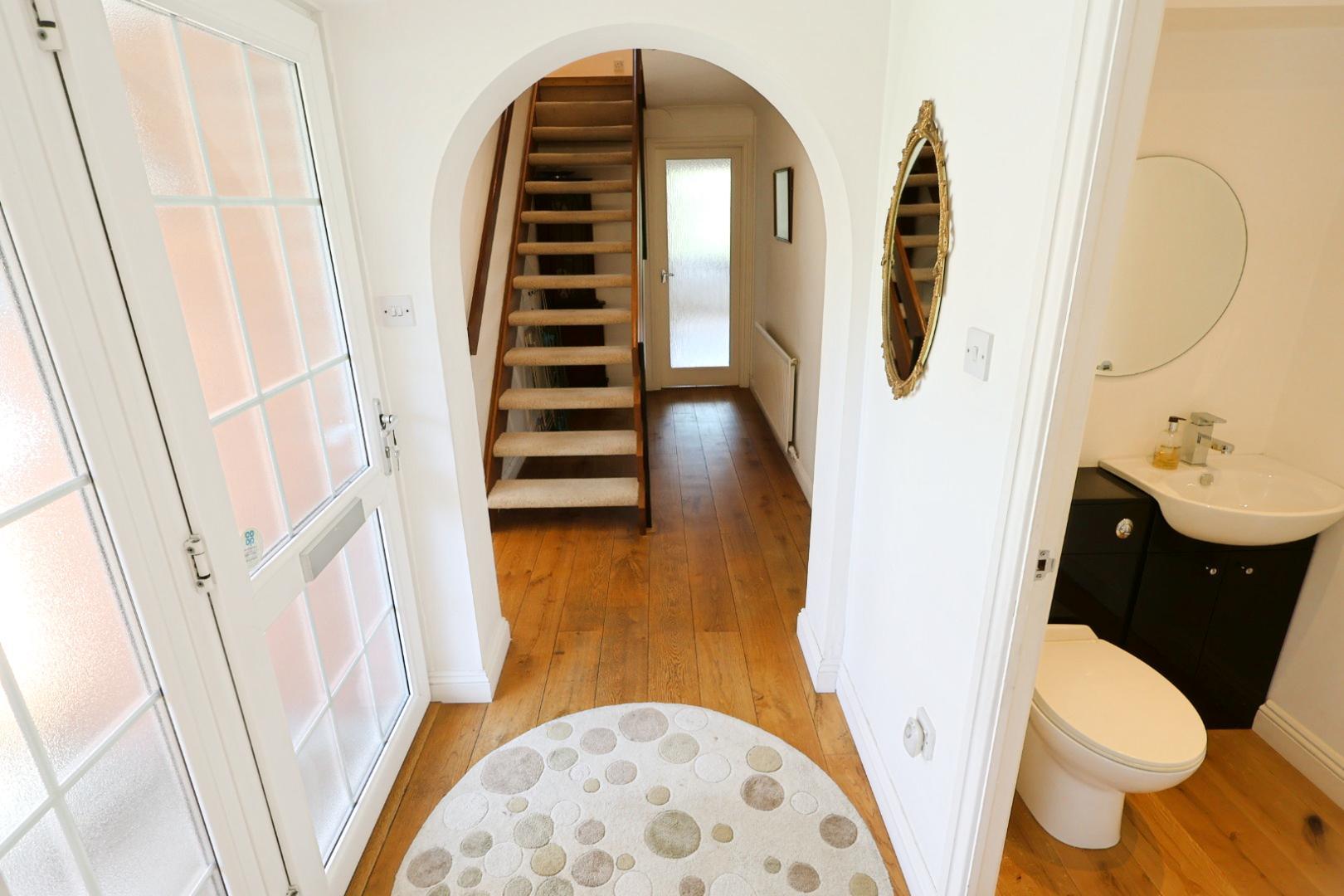 The property is entered via an opaque uPVC double-glazed front door opening into an inviting entrance hall with engineered oak flooring, a radiator, and an open staircase rising to the first floor. Doors lead to the cloakroom WC, dining room (via sliding door), and glazed doors to the living room and kitchen.
