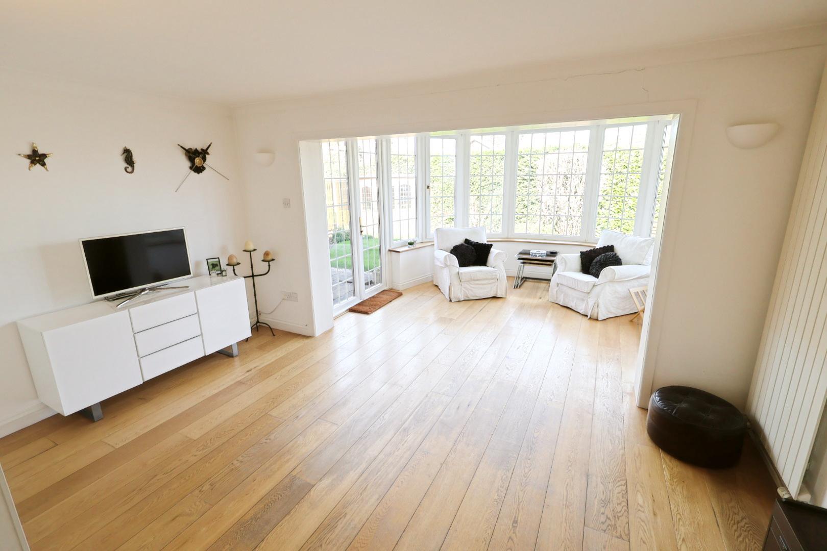 Featuring continued engineered oak flooring and offering panoramic views of the rear garden, with integrated French doors and recessed ceiling downlights.