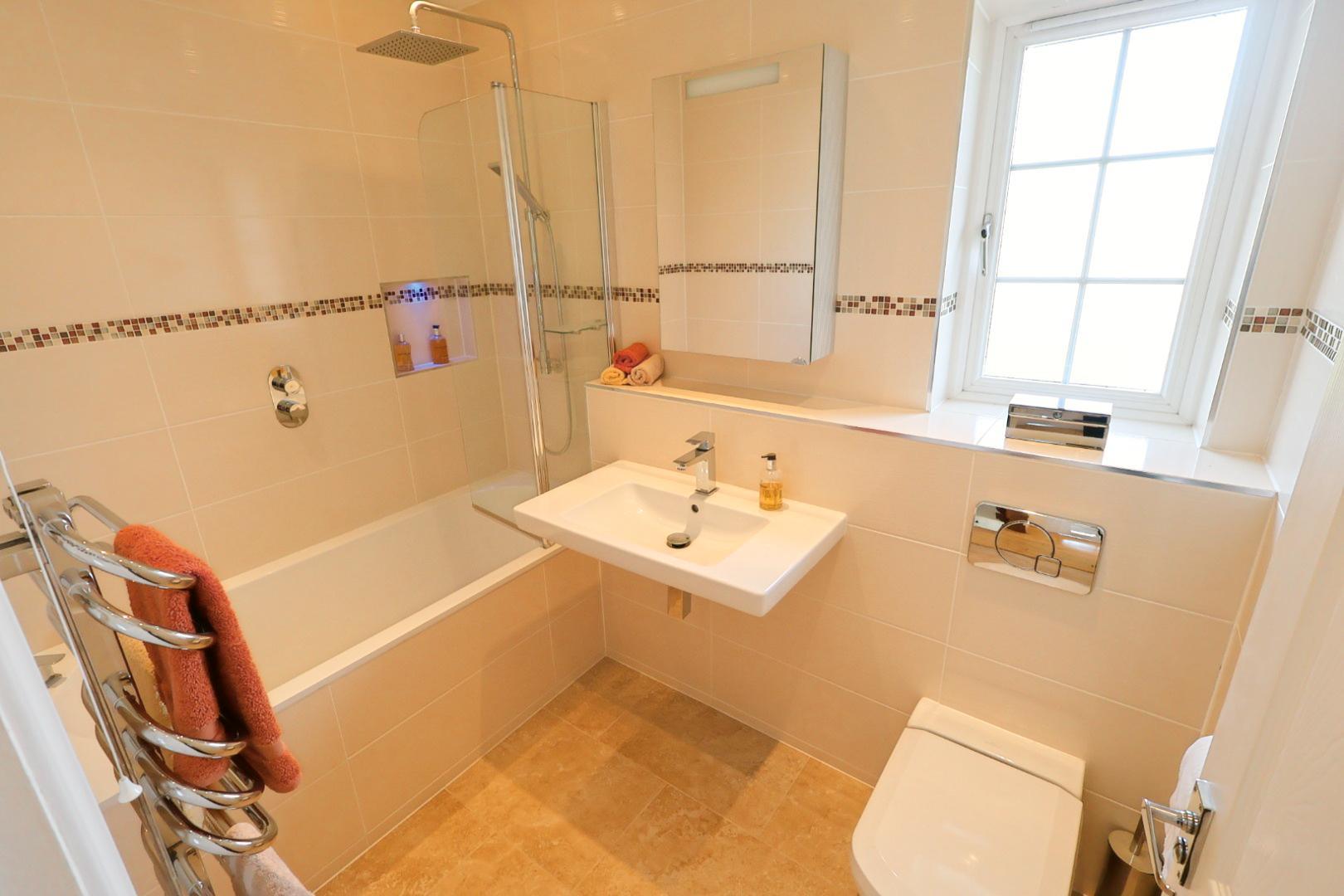 Fitted with a contemporary white three-piece suite by Villeroy & Boch, comprising a panelled bath with dual-head thermostatic shower and glass screen, wall-mounted wash basin with mixer tap, and concealed cistern WC.