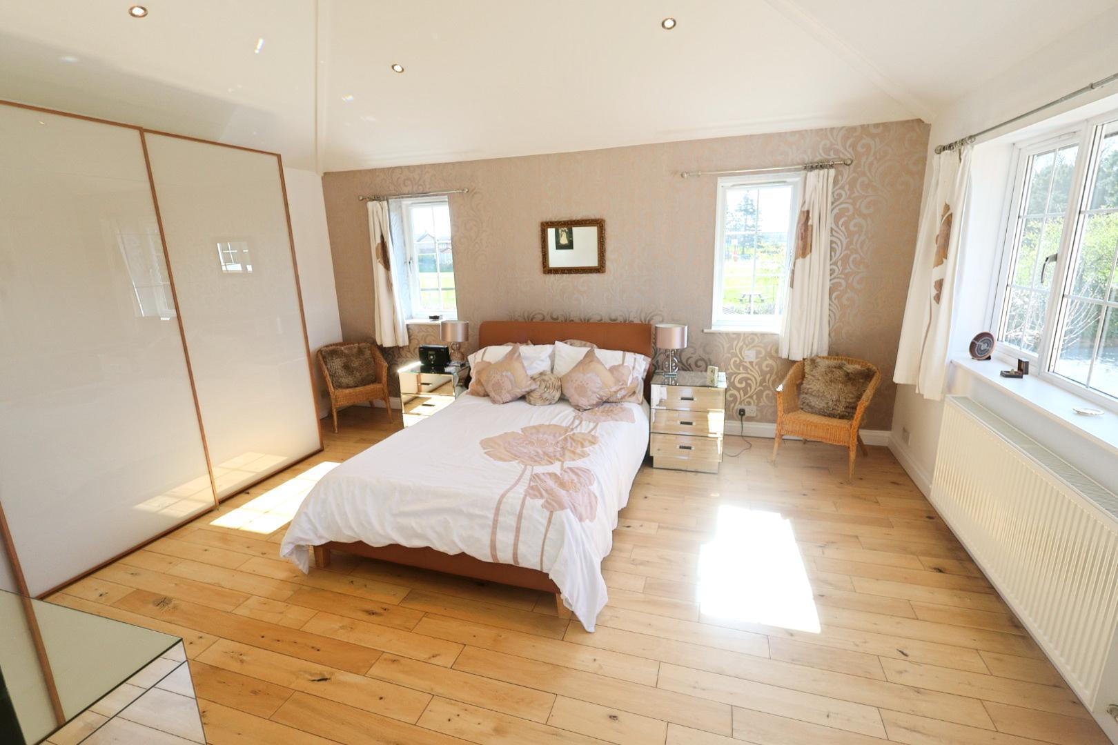 The ground floor accommodation is completed by a double-aspect dining room. The first-floor landing offers access to a principal bedroom suite with dressing room and en-suite, along with a bedroom featuring a vaulted ceiling. There are also three further bedrooms and a stunning Villeroy & Boch three-piece family bathroom.