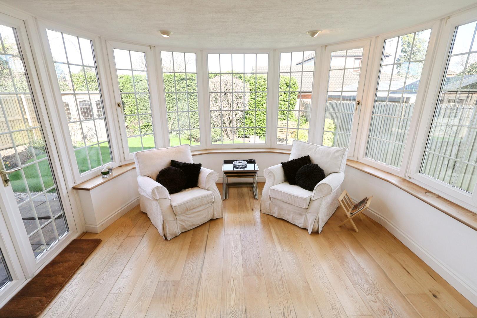 A dual-aspect room with windows to both side elevations, engineered oak flooring, recessed downlights, and a radiator.