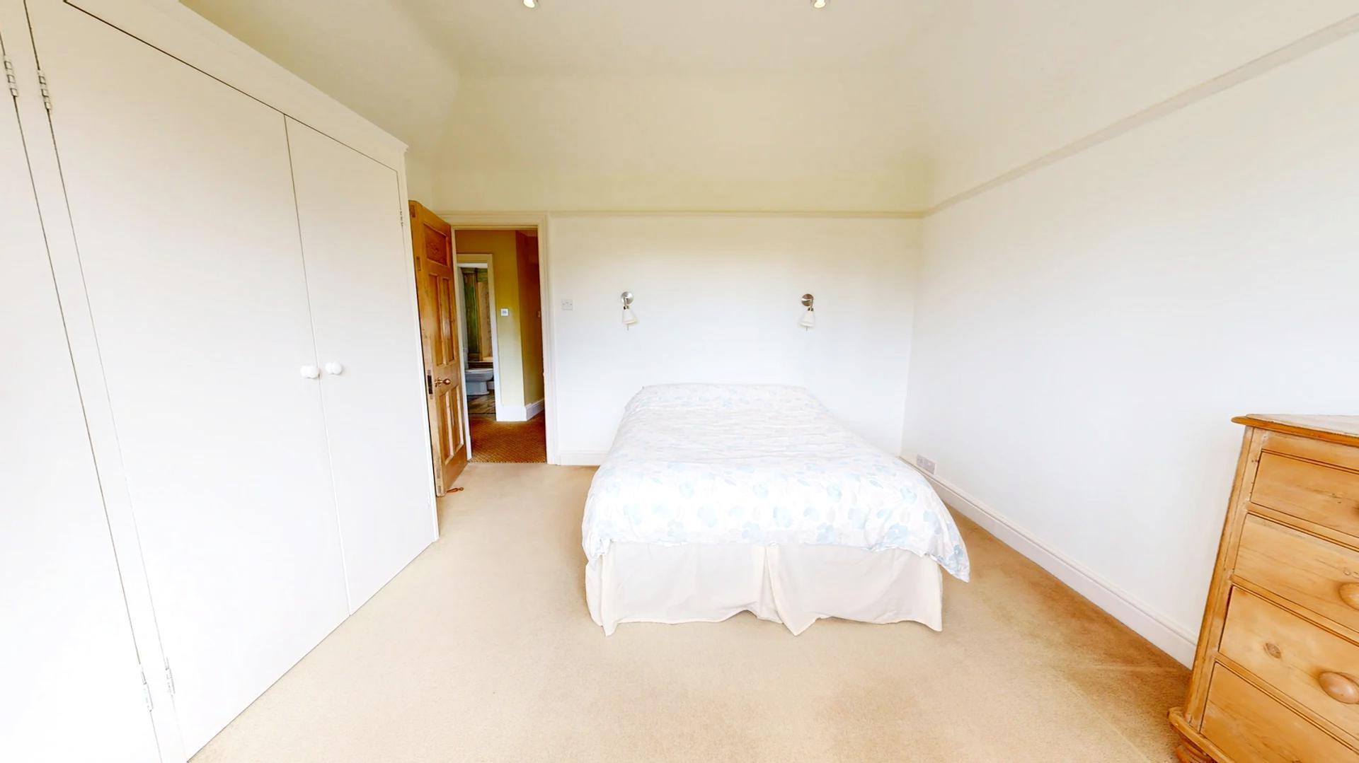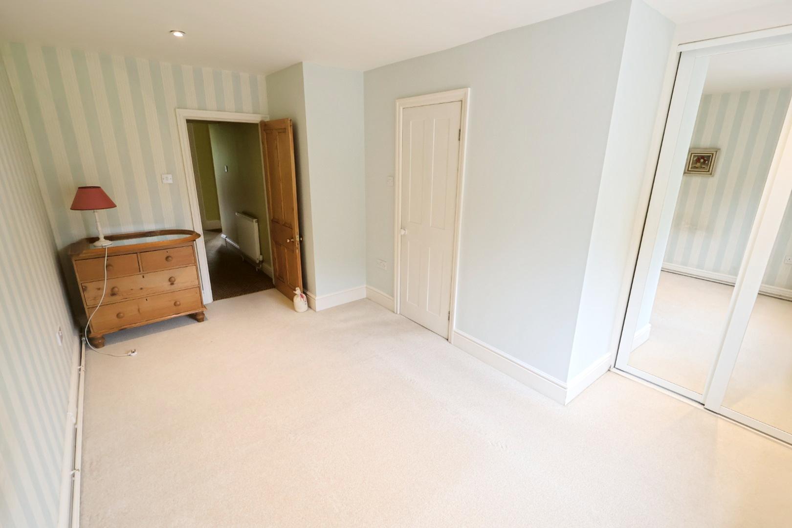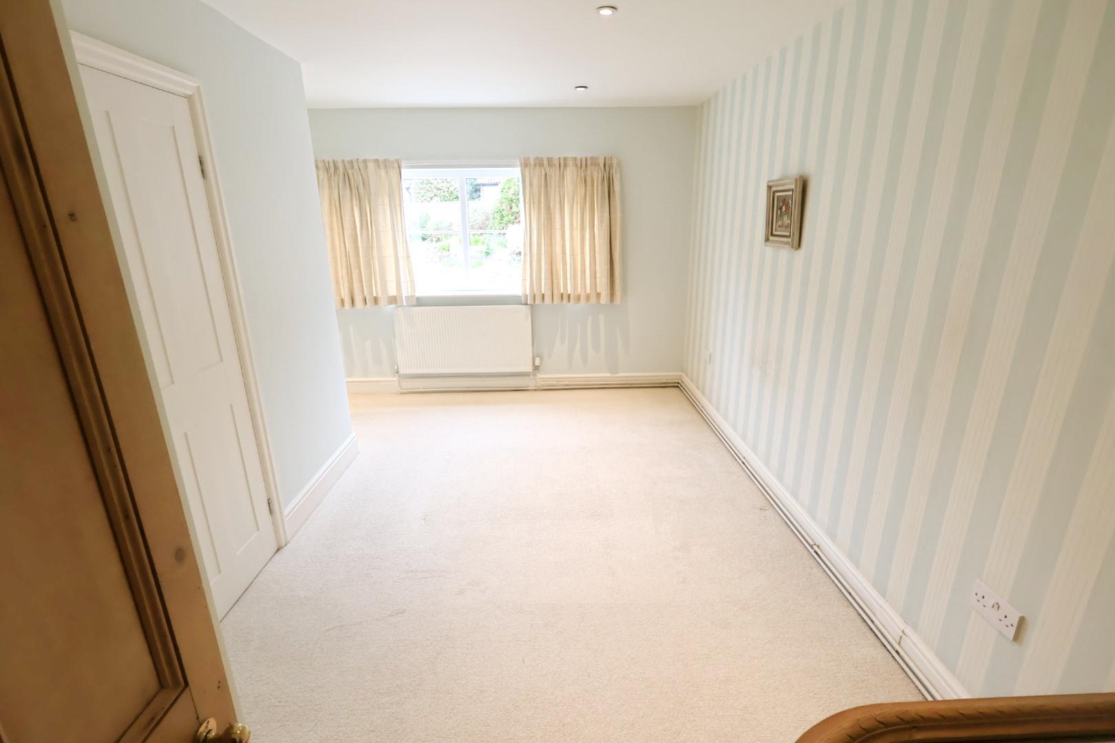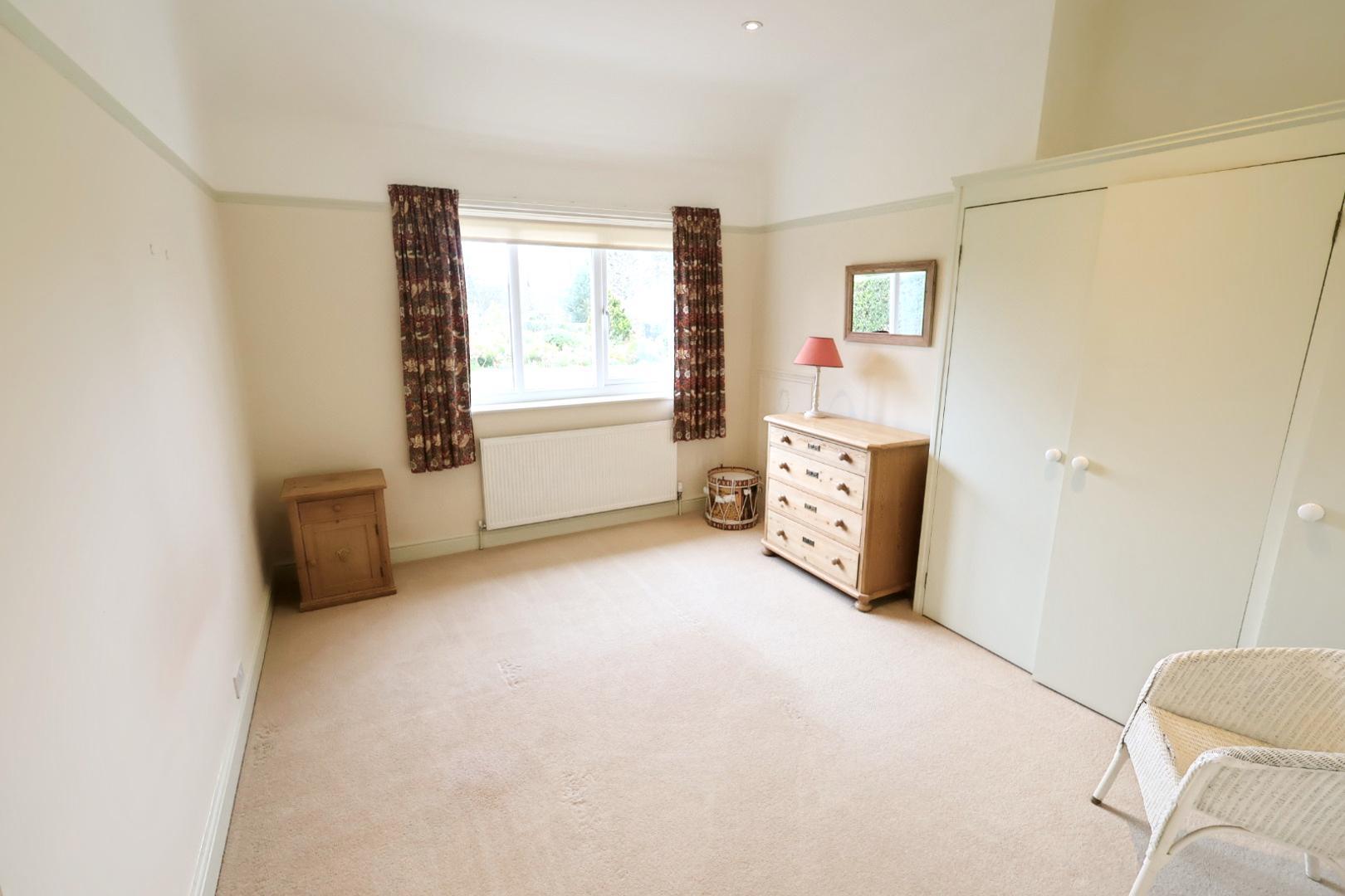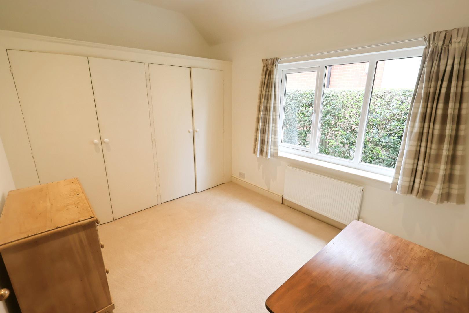 Featuring two sets of fitted double wardrobes, semi-vaulted ceiling with exposed beams,, recessed downlights, A window overlooks the rear garden, with a radiator below.