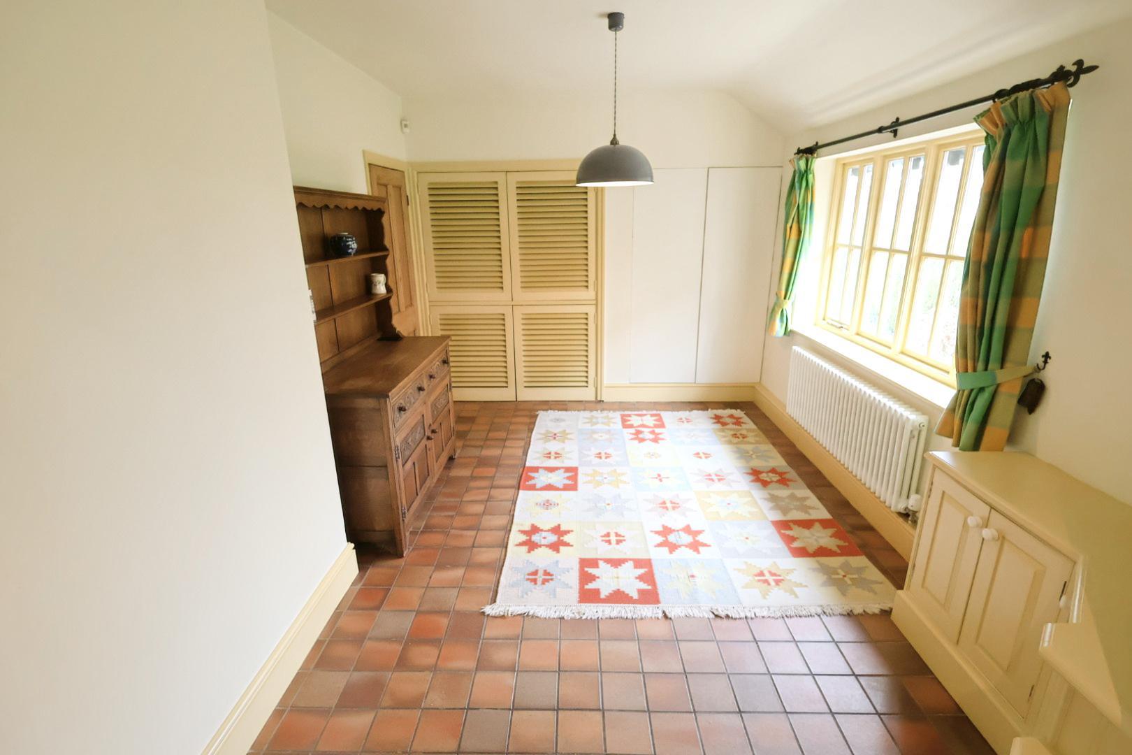 With a double glazed window to the side elevation, a white column-style radiator, quarry tile flooring, and built-in cupboards running the length of one wall. An open throughway leads to the kitchen.