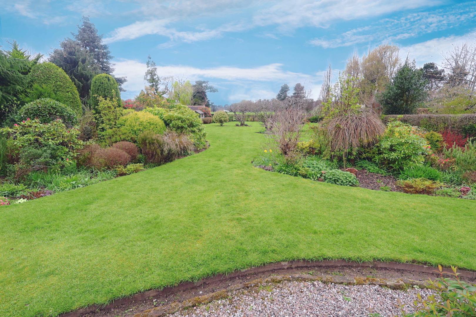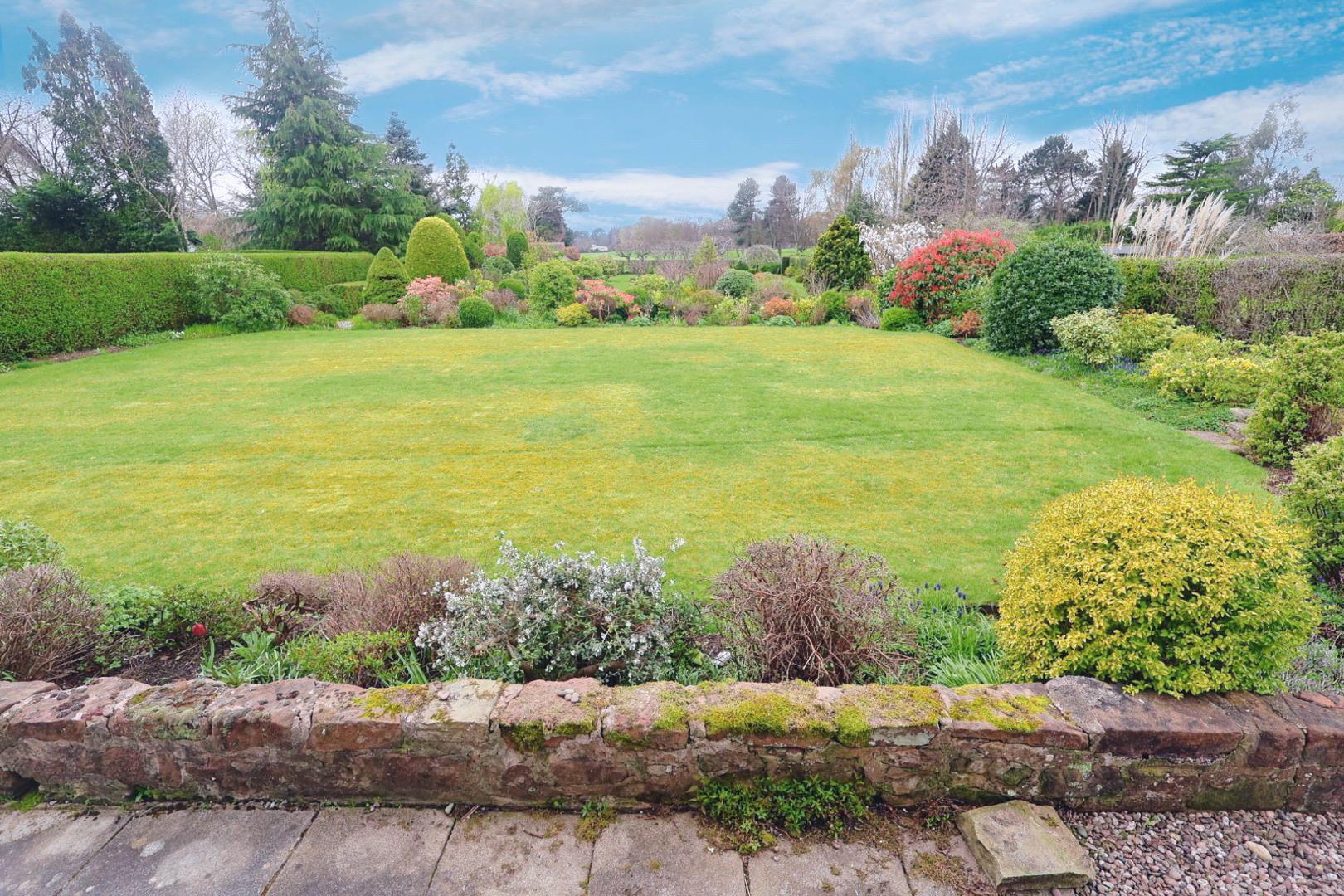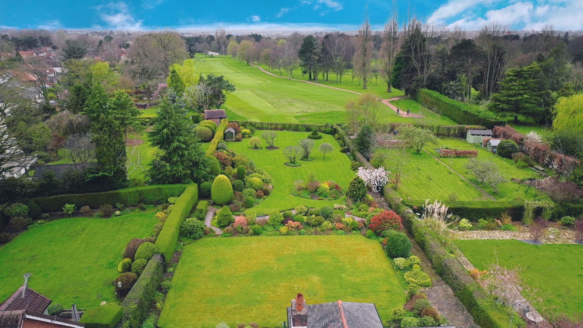 Accessed via a timber gate on the right-hand side, with a paved pathway running alongside a timber shed. This leads to an expanse of immaculately presented gardens, featuring a gravel seating area, lawned gardens, and paved pathways, all well stocked with a beautiful variety of established plants, shrubs, and trees. A further timber shed is located to the rear of the garden. The garden is enclosed by low hedging, with the rear boundary backing onto Upton Golf Course and a gate allowing direct access.