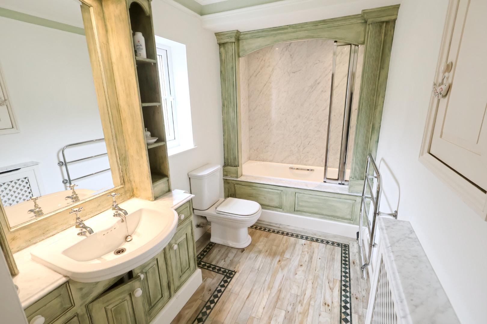 The bathroom is fitted with a three-piece suite comprising a white bath with mixer tap and thermostatic shower above, marble-panelled walls, and a folding screen. There is a low-level WC and a vanity unit with marble countertop, wash hand basin, illuminated mirror, and shelving. The flooring is Amtico , and there is a radiator, chrome heated towel rail, and an opaque UPVC double glazed window to the side.