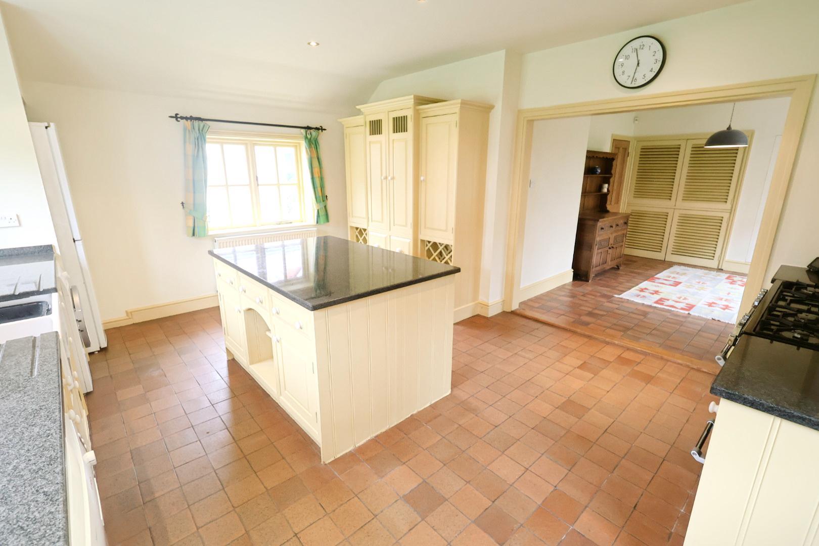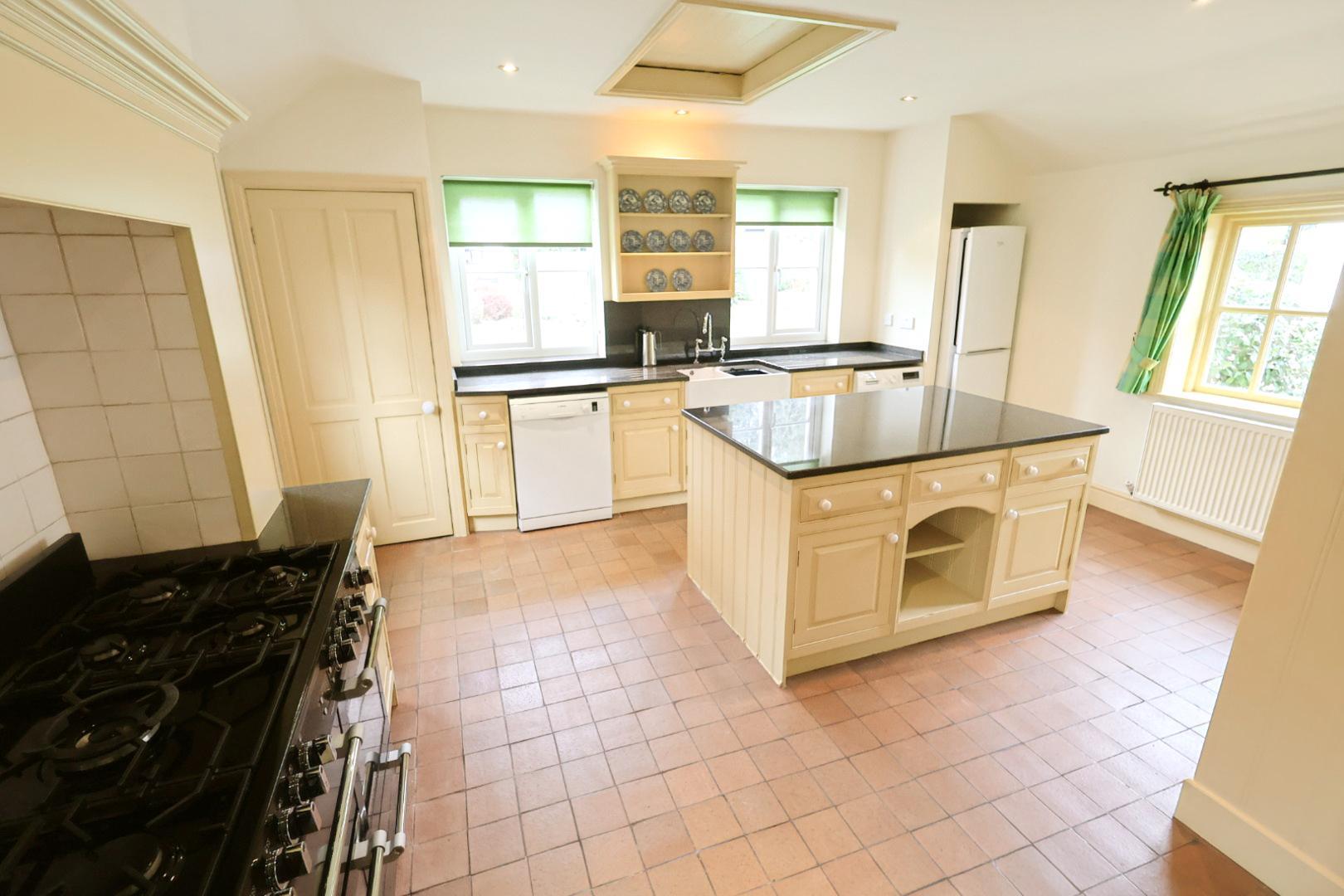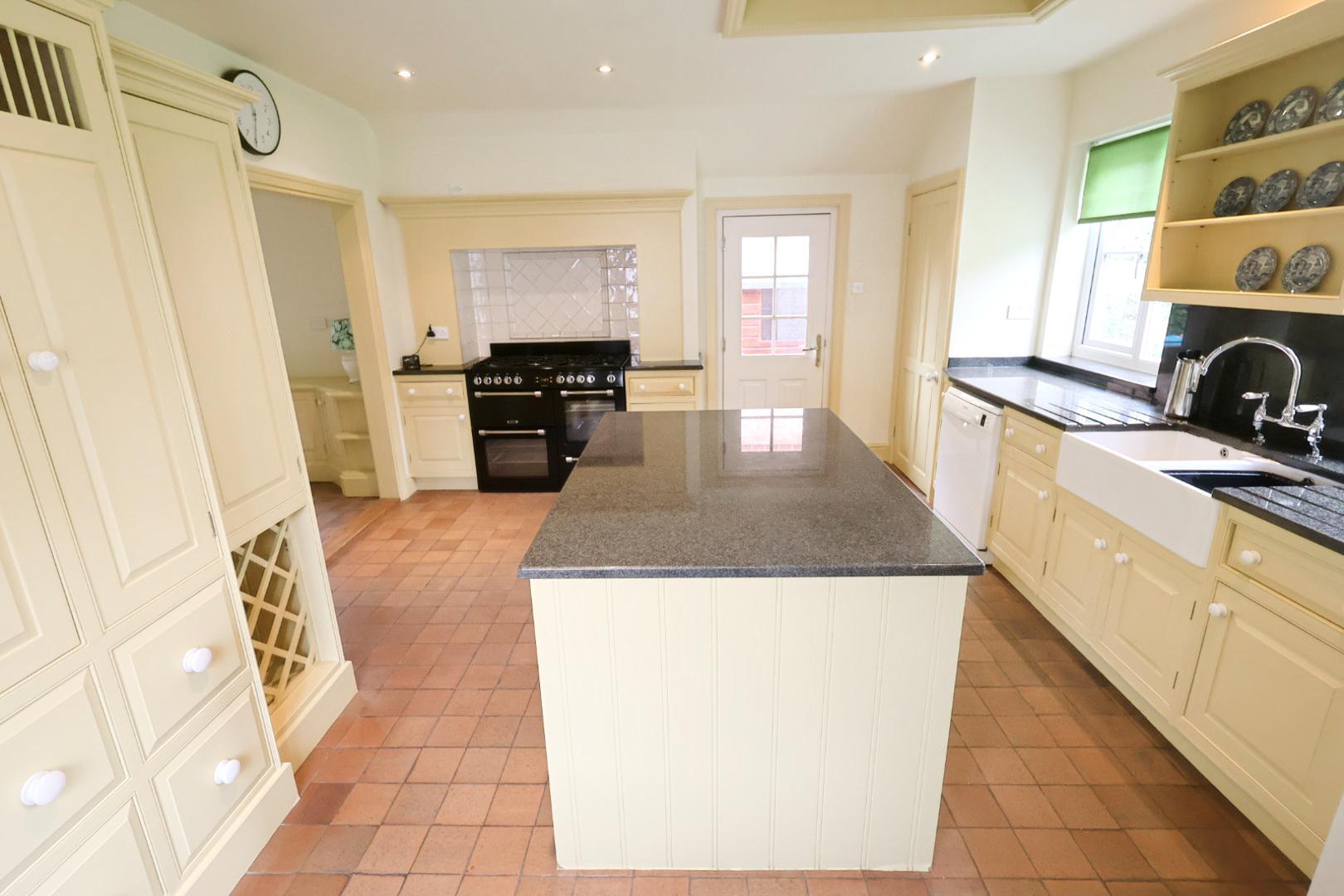 Fitted with a stylish kitchen comprising inset doors, drawers, and cabinets with granite work surfaces, housing a double Belfast sink with mixer tap. Granite upstands and shelving sit above, along with a complementary island unit incorporating further drawers and cupboards. There is space for a range cooker with extractor hood above and tiled splashback, as well as space and plumbing for a washing machine and dishwasher, and space for a tall fridge freezer. A built-in cupboard houses the gas Worcester combination boiler. Additional features include quarry tile flooring throughout, a radiator, recessed downlights, a double-glazed window to the side elevation, two UPVC double glazed windows to the front, and a composite double-glazed back door leading to the side of the house.
