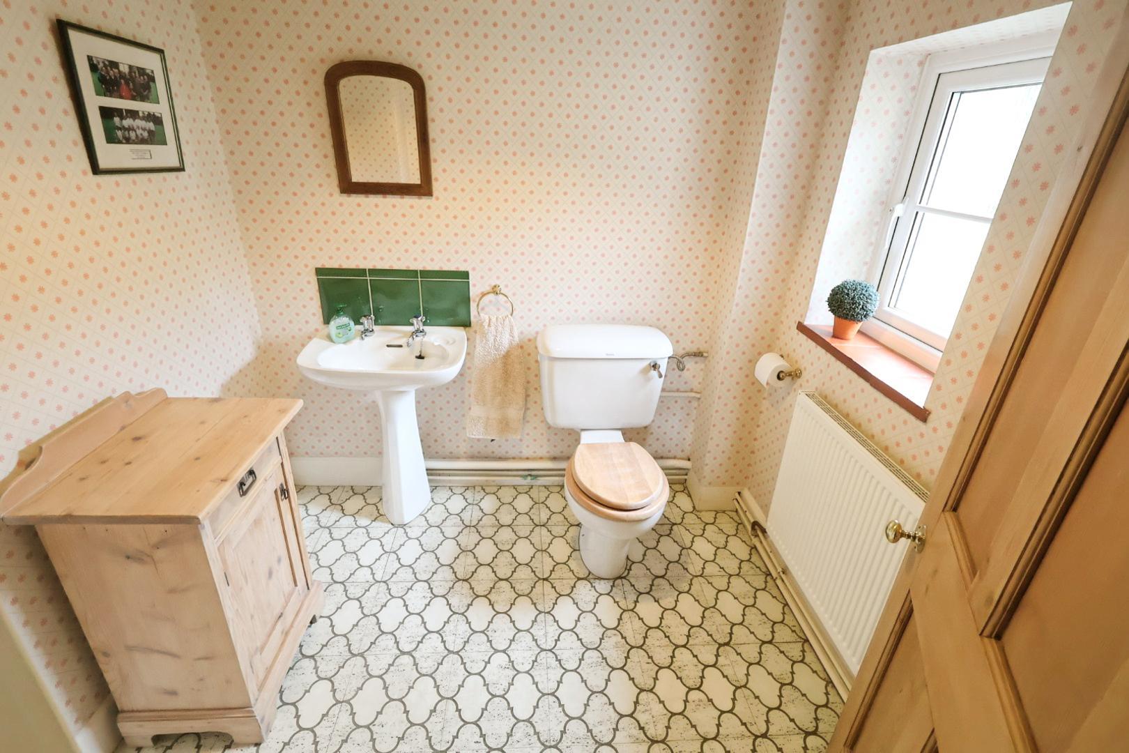 A spacious cloakroom approached through a useful area for hanging coats and storing shoes, comprising a radiator, an opaque UPVC double glazed window to the side elevation, a low-level WC, a pedestal wash hand basin, and Amtico flooring.