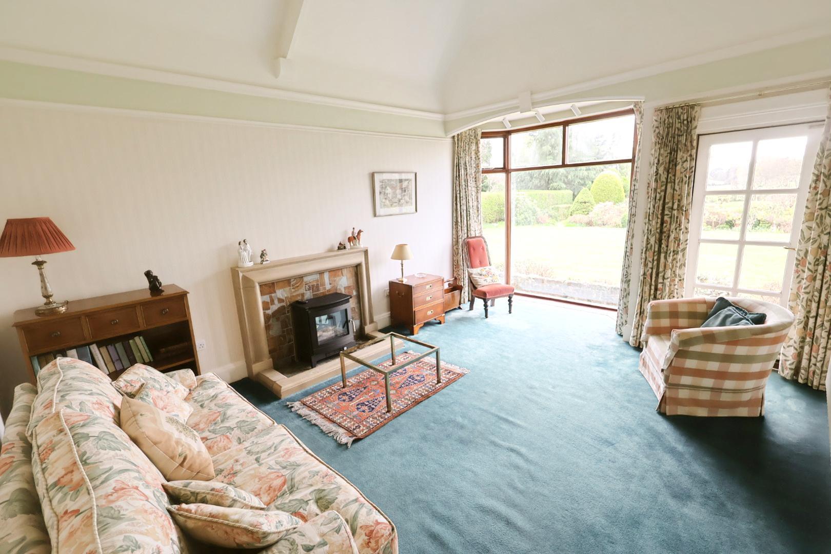 Boasting a semi-vaulted ceiling with an exposed central beam and a bay window to the rear elevation, offering panoramic views over the garden and golf course beyond. A central slate and sandstone fireplace provides a focal point. Additional features include a column-style radiator and a double glazed door opening to the rear garden.