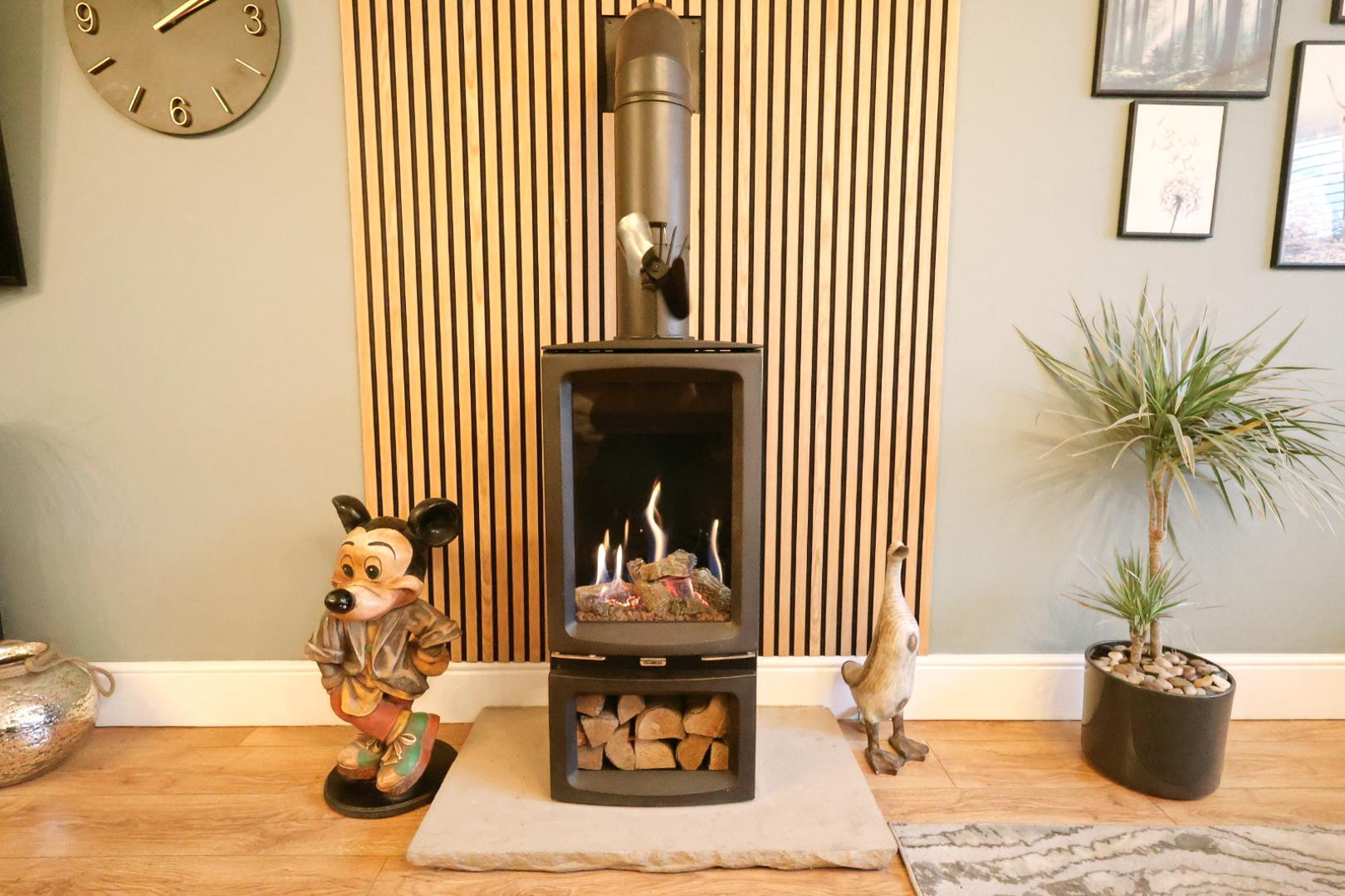 A generously proportioned living room with continuation of the woodgrain-effect laminate flooring, a large front-facing window, anthracite column-style radiator, patio doors opening to the conservatory, and a contemporary living flame-style log burner.