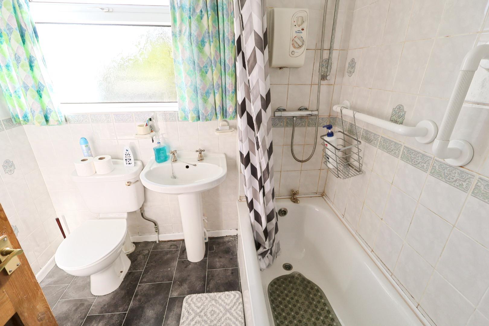 Appointed with tiled walls, an opaque side window and a built-in shelved linen cupboard. Fitted with a panelled bath with thermostatic shower above, pedestal wash basin, low-level WC and a chrome heated towel rail.