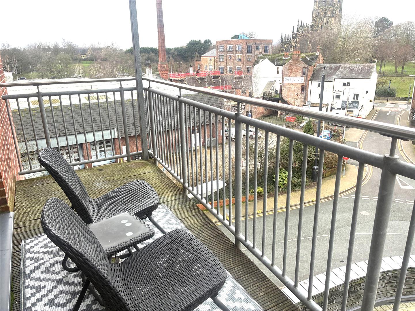 Decked seating area accessed from the lounge, with views over Eagles Meadow and St Giles Church.