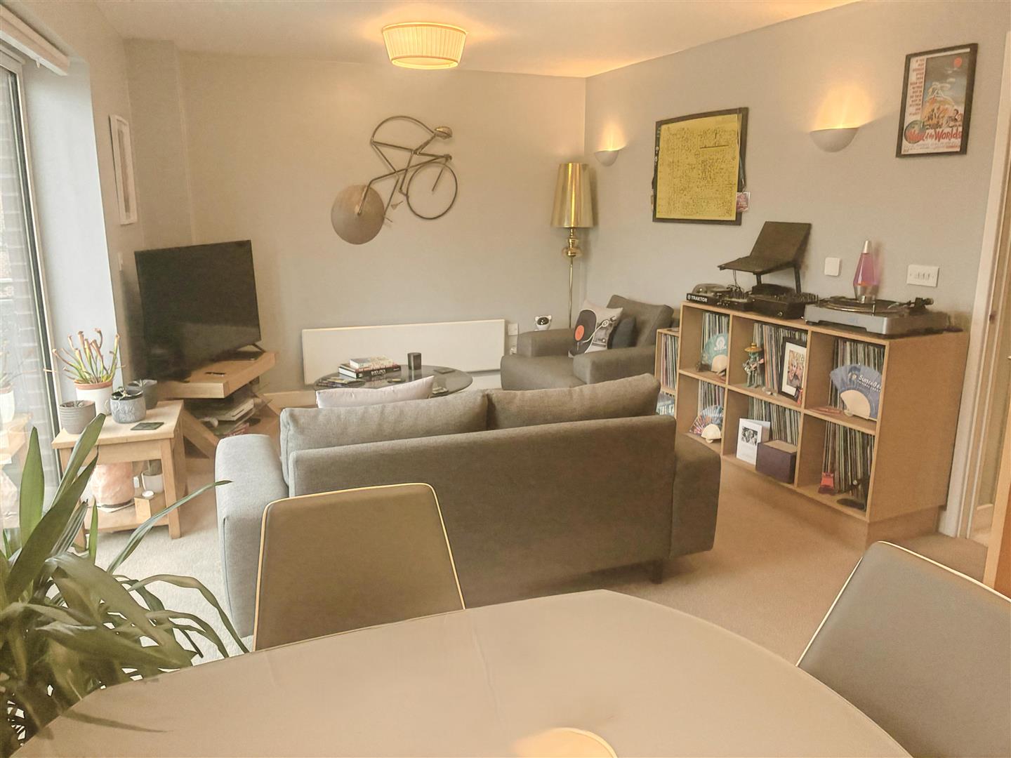 Open-plan living space with wood-effect flooring kitchen, and carpet in lounge area, double-glazed sliding doors leading to the balcony, offering views over Eagles Meadow and St Giles Church. The kitchen is fitted with a modern range of wall, base, and drawer units, work surfaces with inset 1¼ bowl sink and drainer, built-in electric oven, four-ring electric hob, stainless steel splashback and extractor, integrated fridge/freezer, and dishwasher, includes smart thermostat for remote heating access.