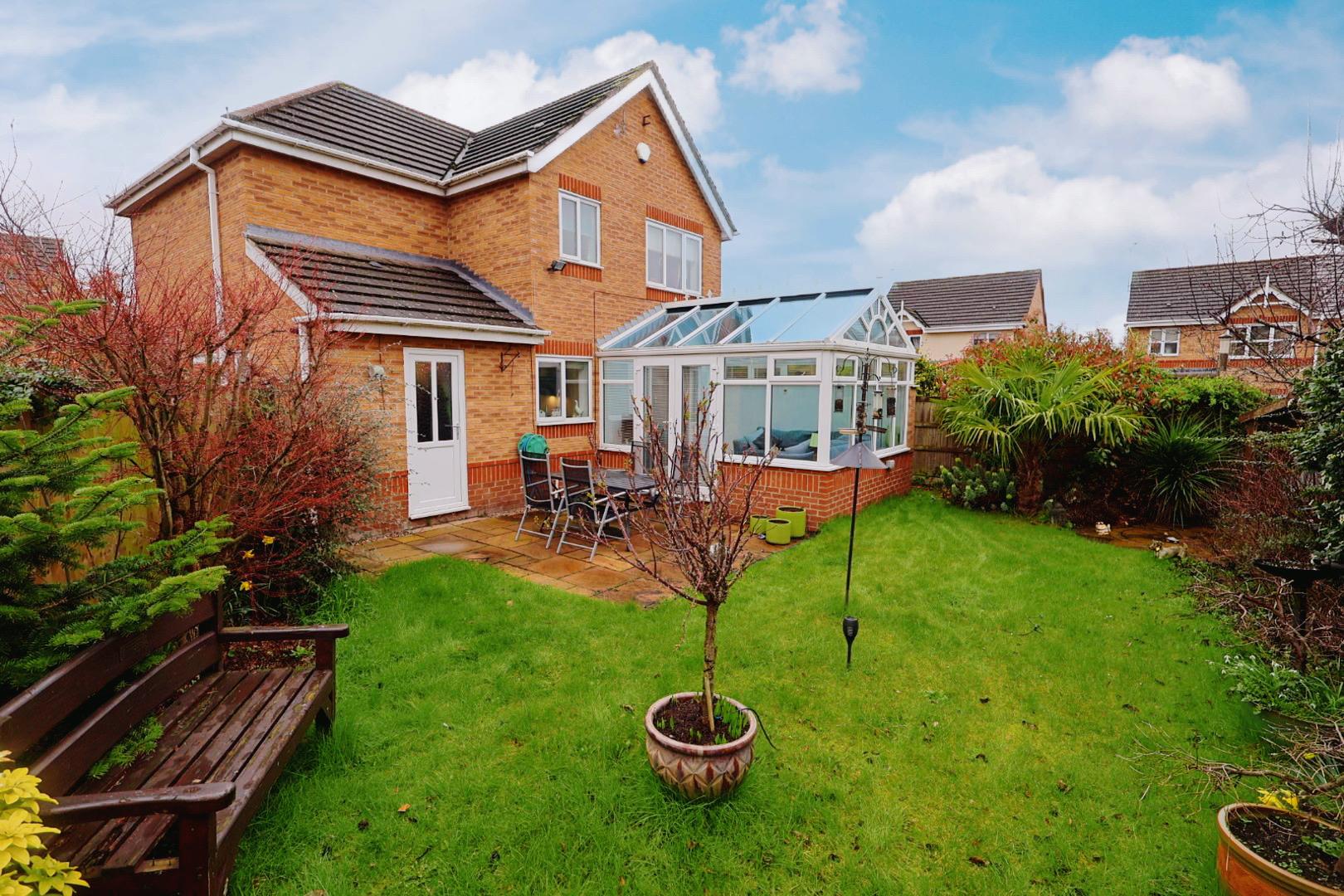 Forming part of this modern development and occupying a corner plot, this light and spacious detached family home benefits from uPVC double glazing and gas central heating. The accommodation briefly comprises an entrance hall, living room with open access to the dining room, a generous conservatory overlooking the rear garden, a contemporary kitchen fitted with gloss grey units and integrated appliances, a utility room and a cloakroom WC. The first floor landing provides access to the family bathroom and three bedrooms, the principal bedroom benefiting from an ensuite shower room. Externally the property offers lawned gardens to the front and side, off-road parking directly in front of the single garage and timber gated side access leading to a south-east facing rear garden with two patio areas, lawn and enclosed boundaries.