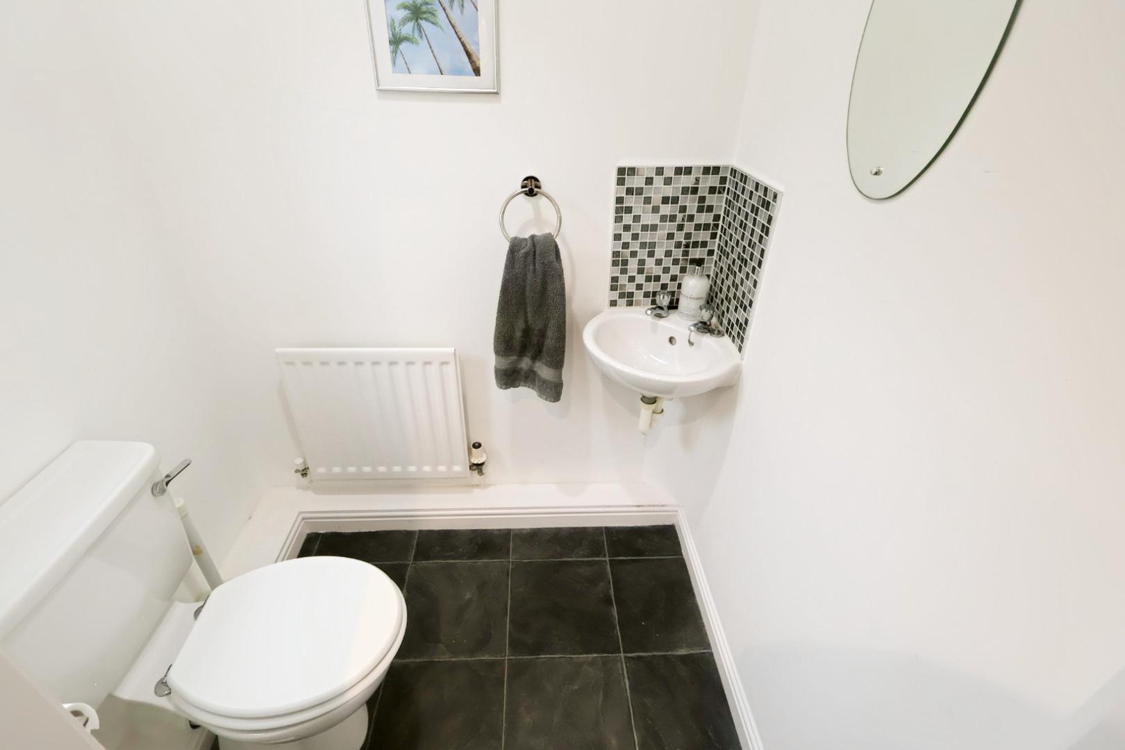 The cloakroom is fitted with a white two-piece suite comprising a low-level WC and corner wash hand basin with tiled splashback. The room also includes a radiator and an opaque window to the rear elevation.