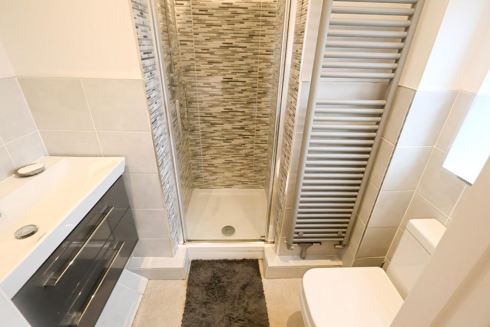Arranged in a T-shaped layout, the ensuite is fitted with a contemporary three-piece suite comprising a separate shower enclosure with dual-head thermostatic shower, a low-level WC and a vanity unit housing an oversized wash hand basin with mixer tap. The walls are partially tiled and the room includes a grey heated towel rail, an opaque window to the front elevation and three recessed ceiling downlights, one incorporating an extractor fan.
