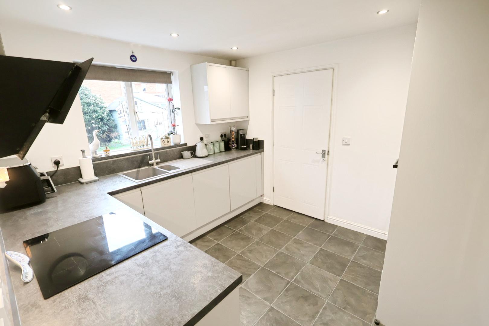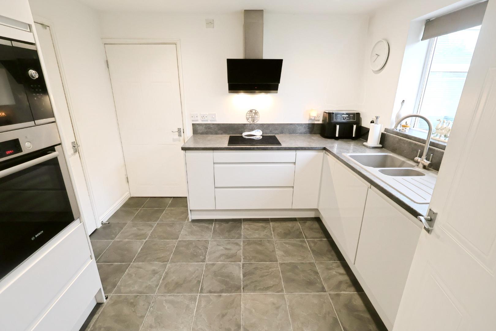 The kitchen is fitted with an array of contemporary gloss grey wall, base and drawer units complemented by work surfaces incorporating a resin one-and-a-half bowl sink unit with mixer tap. Integrated appliances include a stainless steel oven, microwave oven, dishwasher, induction hob with a sloping extractor hood above, and a fridge freezer. The kitchen also benefits from a window facing the rear elevation, recessed ceiling downlights, an understairs storage cupboard and a door leading to the utility room.