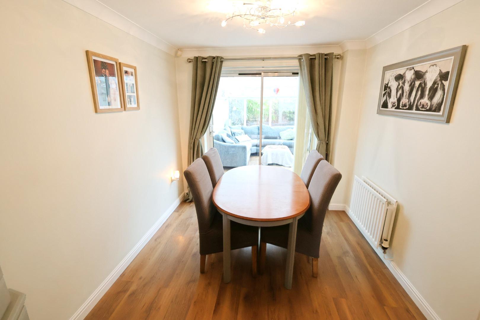 The dining room continues the laminate flooring and includes a radiator and patio doors opening into the conservatory, providing an open flow between the reception areas.