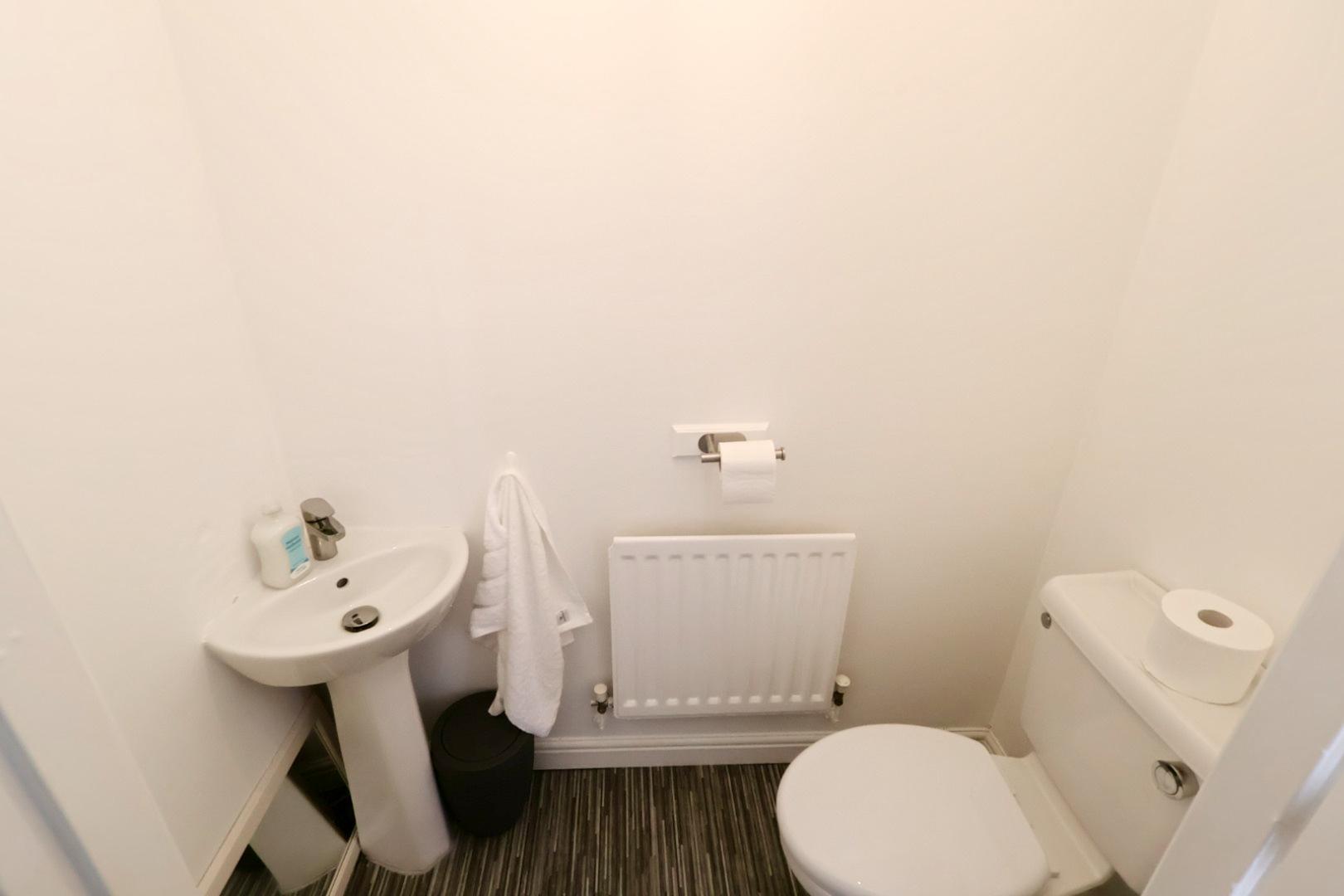 Installed with a dual flush low-level WC and a corner wash hand basin with mixer tap. There is a radiator, an extractor fan, and the electrical consumer unit.