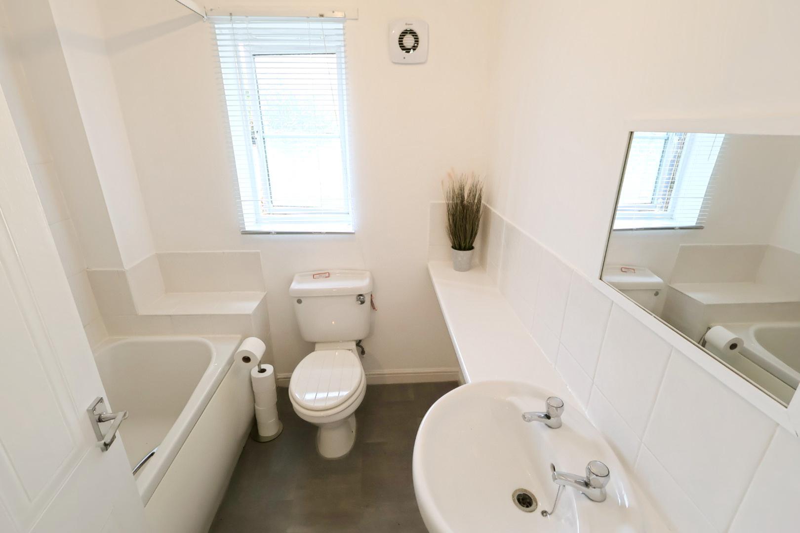Fitted with a three-piece white suite comprising a panelled bath with thermostatic shower, a dual flush low-level WC, and a vanity unit with countertop wash hand basin and tiled splashback. There is a radiator, extractor fan, and an opaque window to the side elevation.