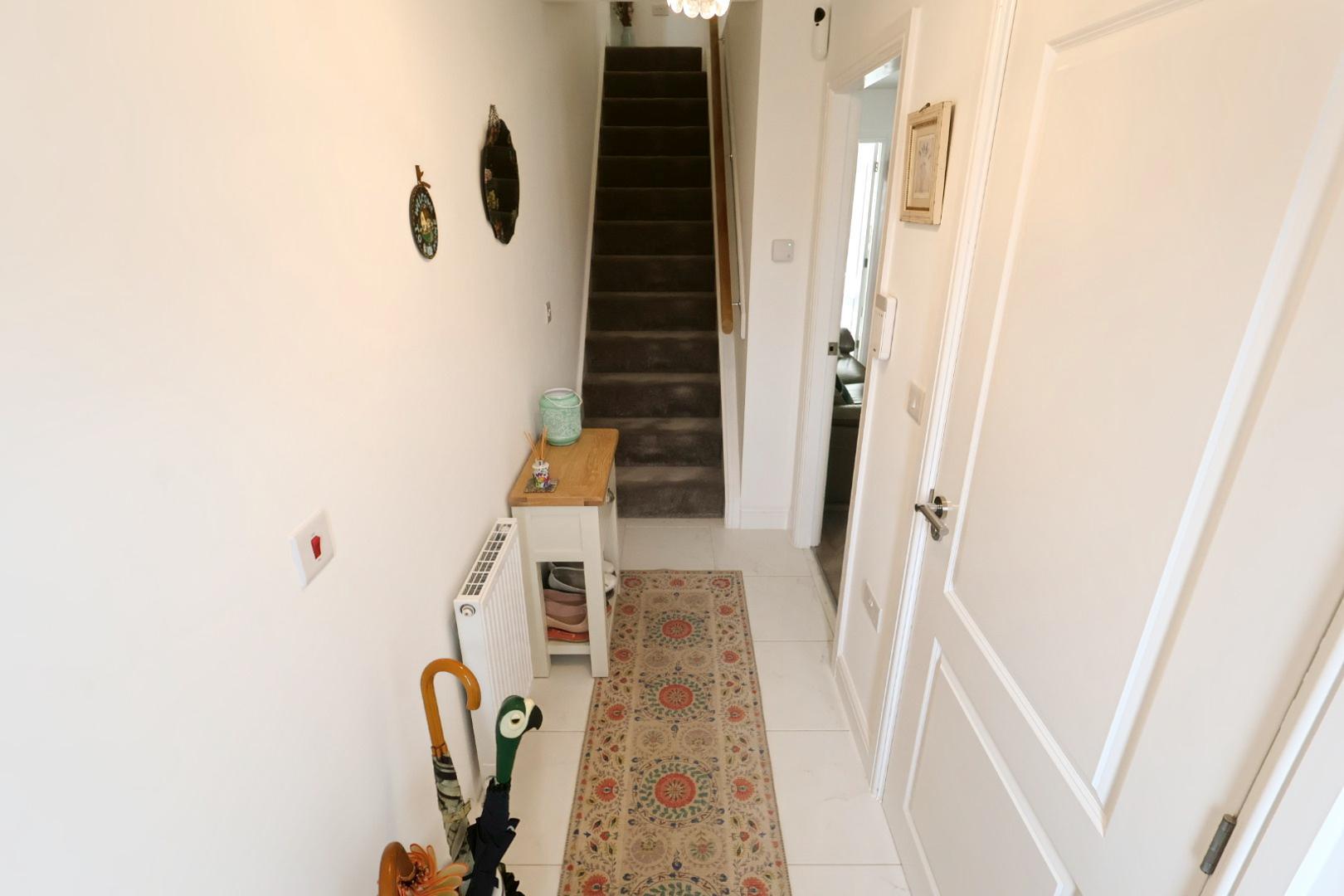 The property is entered via an opaque double-glazed composite front door, opening into a hallway with marble-effect ceramic tile flooring, a radiator, and stairs rising to the first-floor accommodation. Doors lead off to the living room and cloakroom WC.