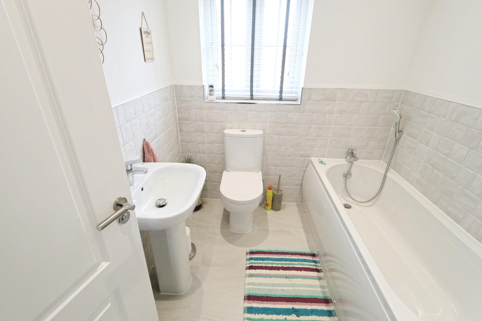 Installed with a modern white three-piece suite comprising a panelled bath with mixer tap and handheld shower attachment, dual-flush low-level WC, and a pedestal wash hand basin. Features include partially tiled walls, an opaque window to the front elevation, a chrome heated towel rail, recessed ceiling downlights, and an extractor fan.