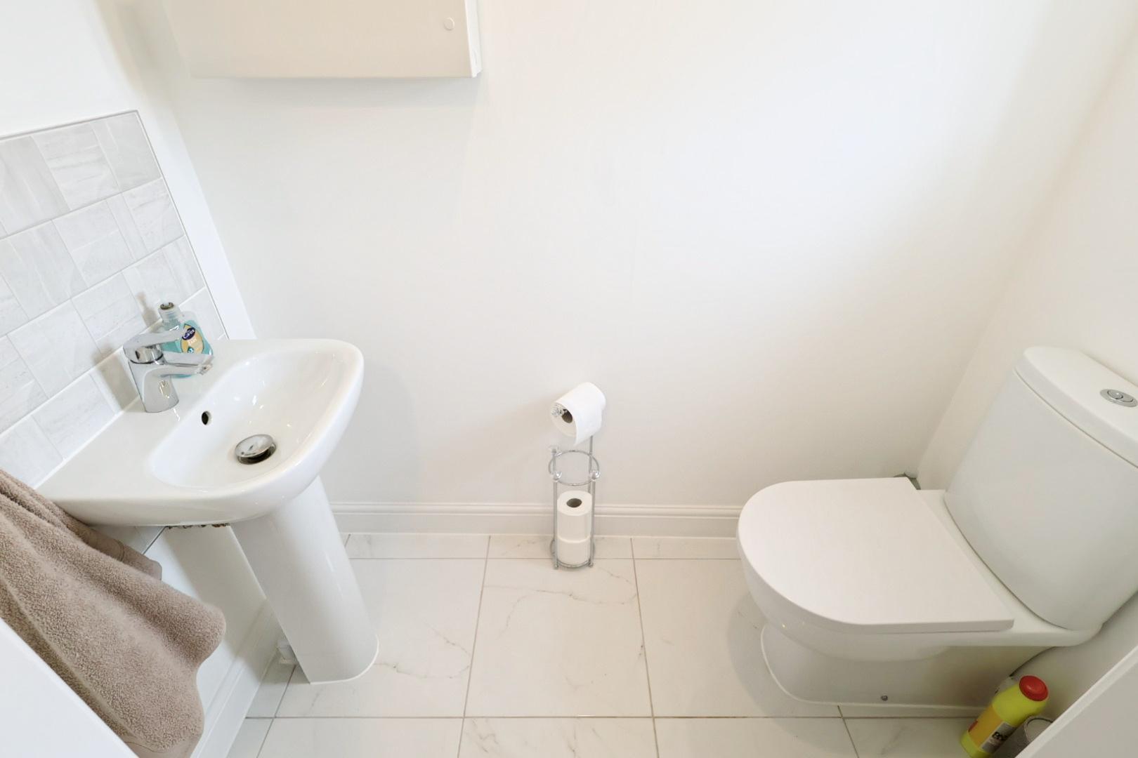 A continuation of the marble-effect ceramic tile flooring leads into the cloakroom, which includes a dual-flush low-level WC, a pedestal wash hand basin with tiled splashback, a radiator, and an opaque window to the front elevation.