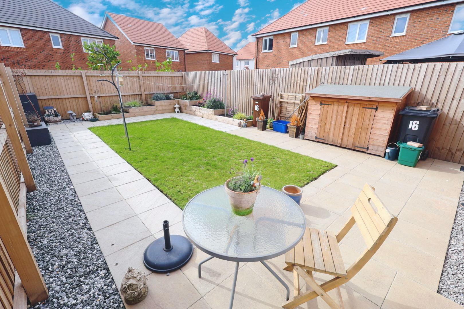 To the front of the property are twin off-road parking spaces, along with a paved pathway leading along the side of the house through timber side access to the rear garden. The pathway also leads to the front door, which is positioned to the right-hand side of a courtesy light. The landscaped rear garden enjoys a sunny southerly orientation. It features a central lawn surrounded by paved pathways, sleeper-raised planters, and includes both an external light and water supply. The garden is enclosed by timber fencing for privacy.