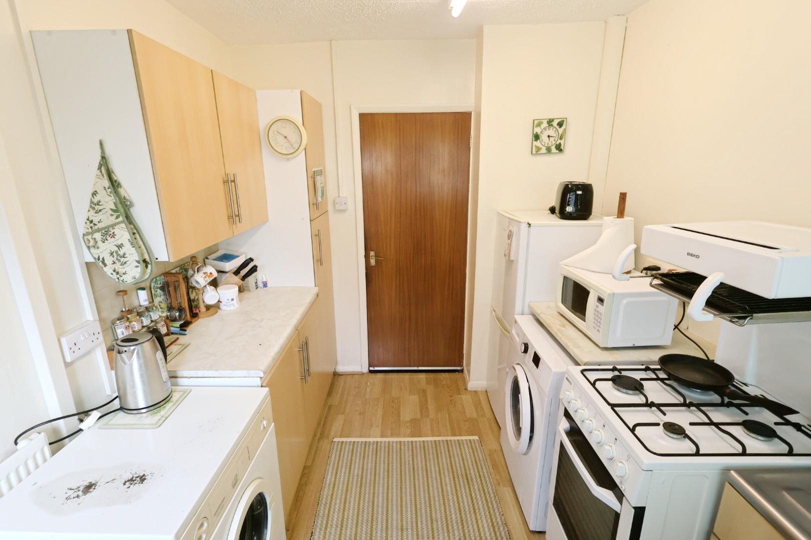 Fitted with light woodgrain-effect wall, base, and drawer units with stainless steel handles. Worksurfaces include a stainless steel single drainer sink with mixer tap and tiled splashback. There is a radiator, space and plumbing for a washing machine, and space for a cooker. A double-glazed window faces the side elevation, and an opaque UPVC double-glazed door also opens to the side.