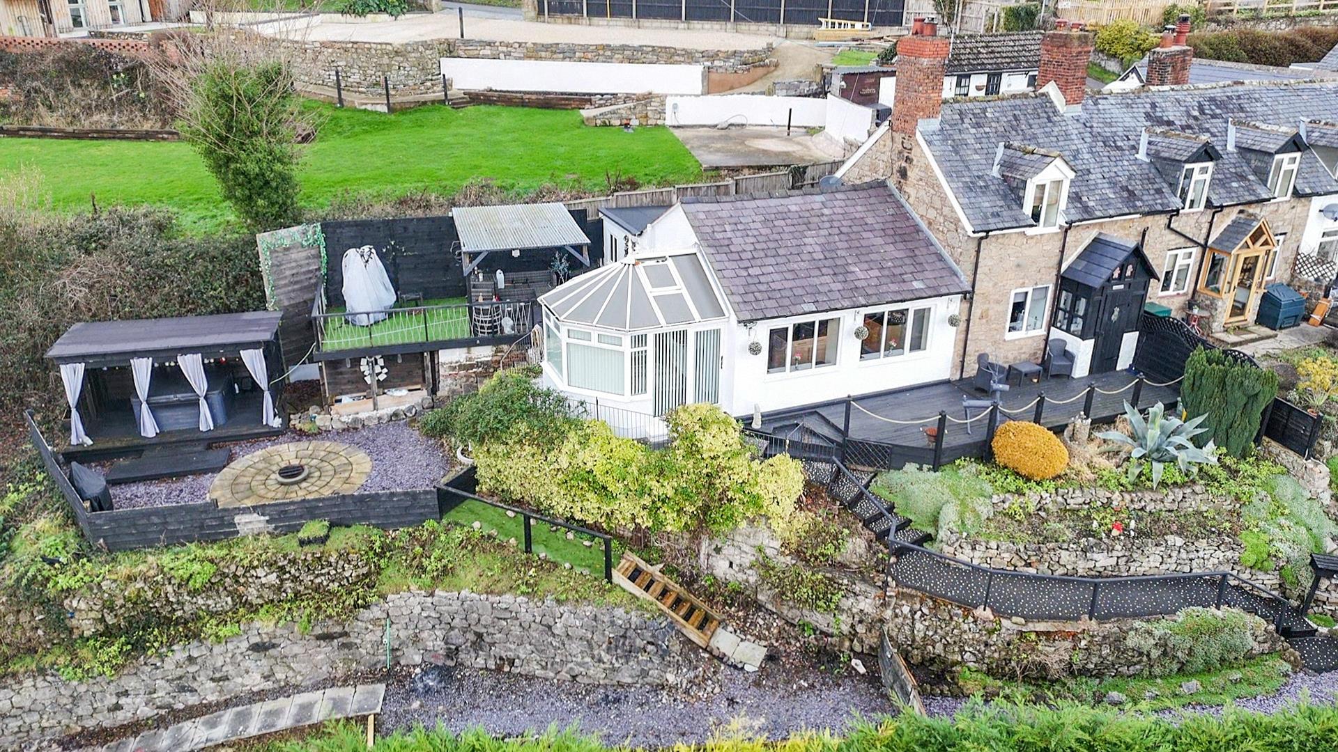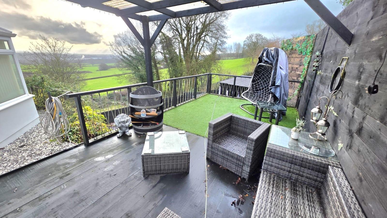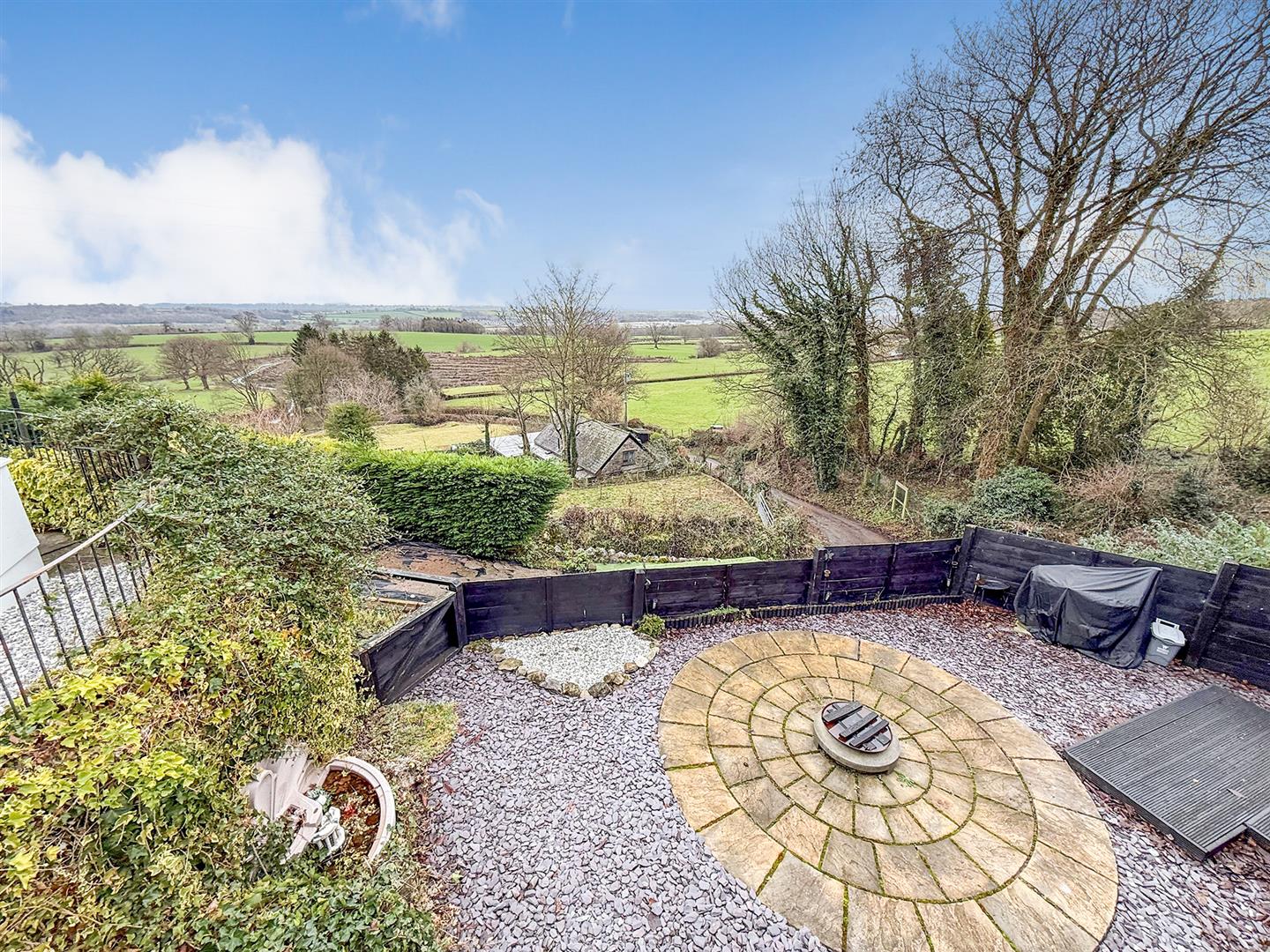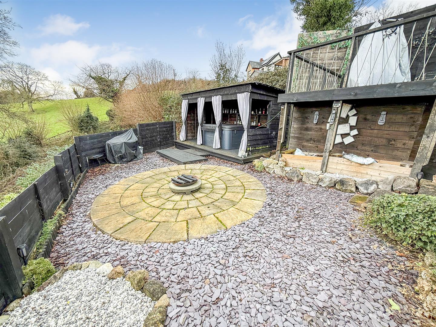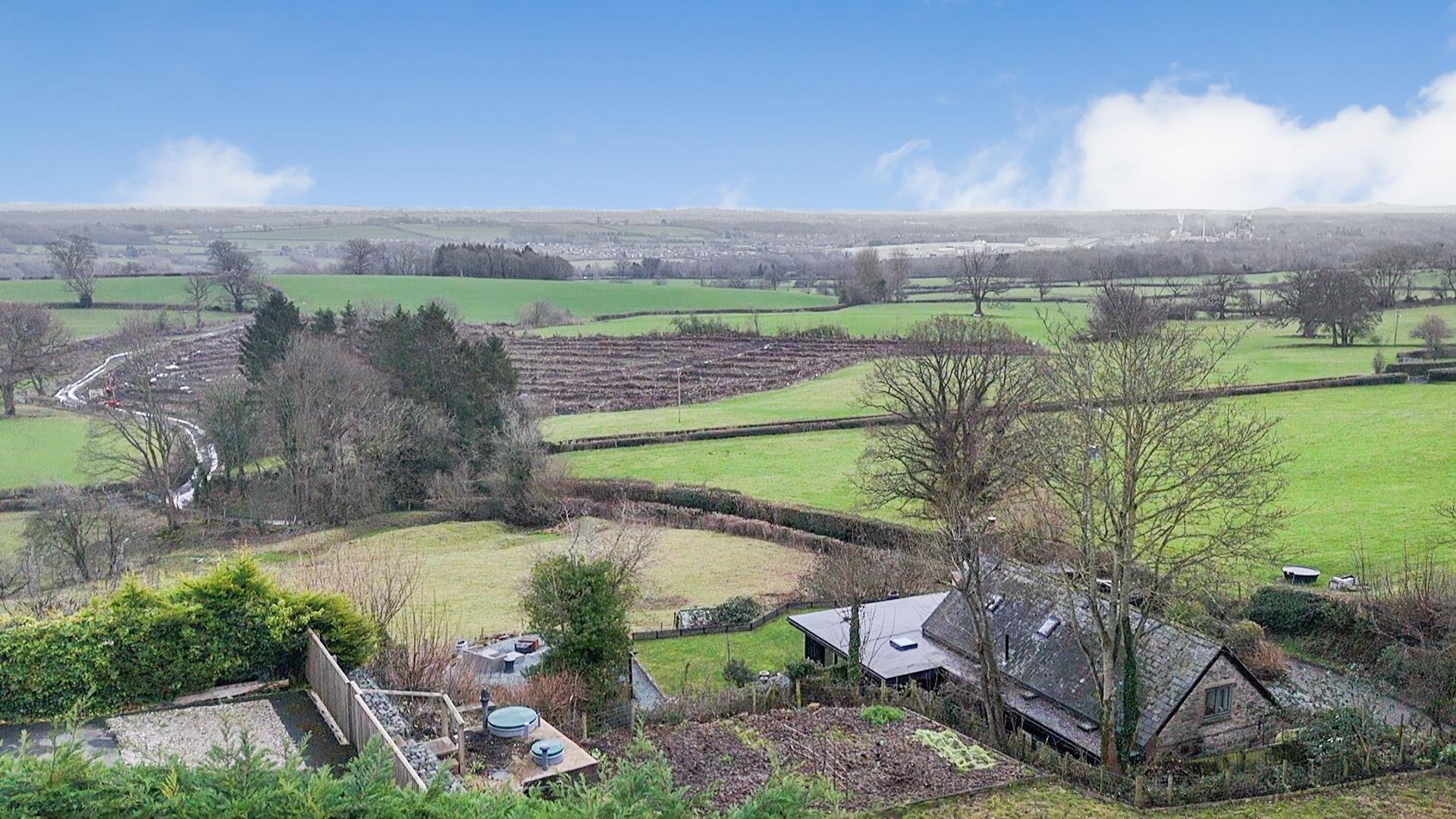 To the side of the property there is a covered decked area with stunning views, a further lower area with circular patio and slate garden with a covered hot tub area. The far side gardens are mostly planted and provide a great space for a potential large summerhouse/ chalet.