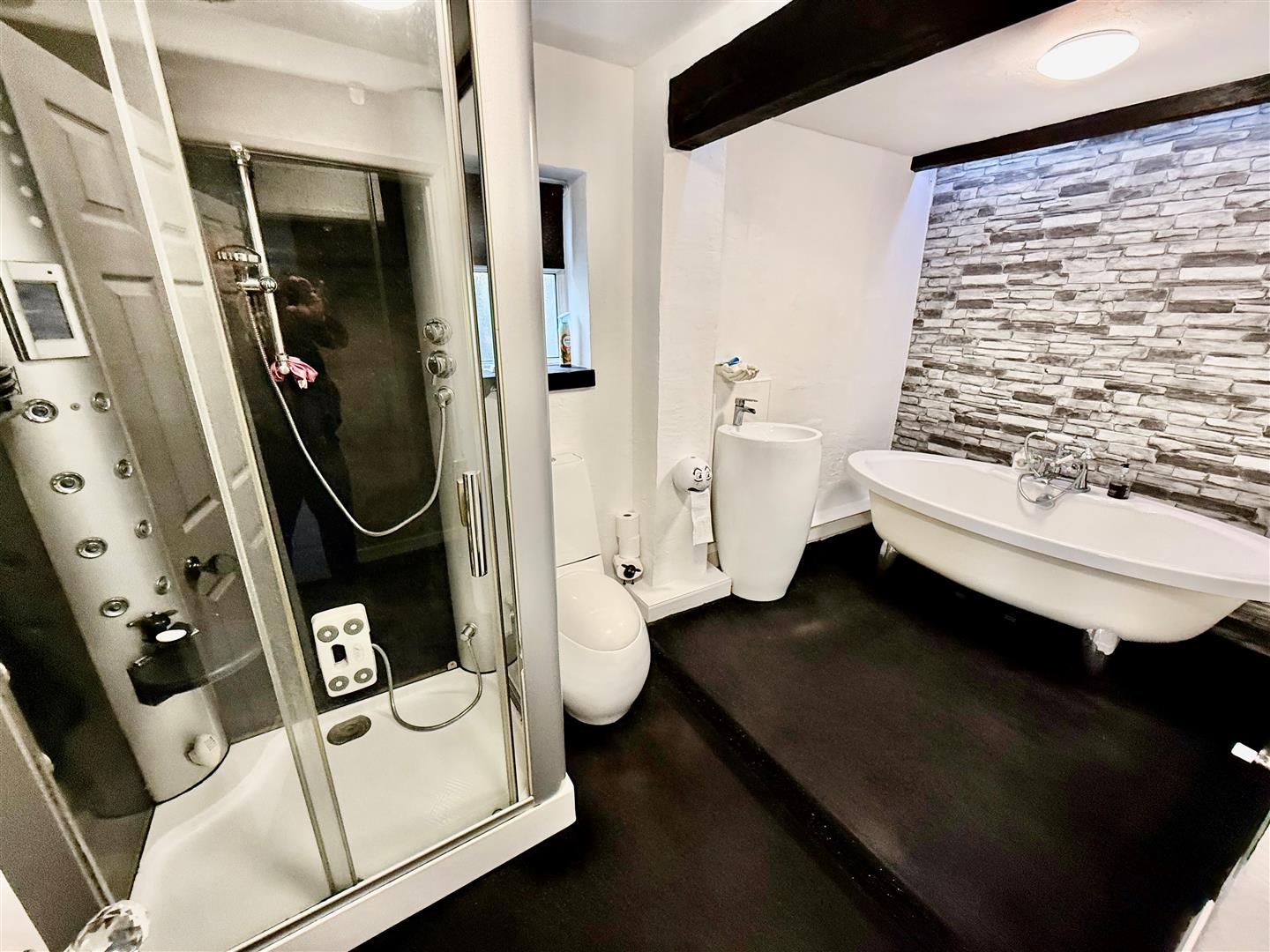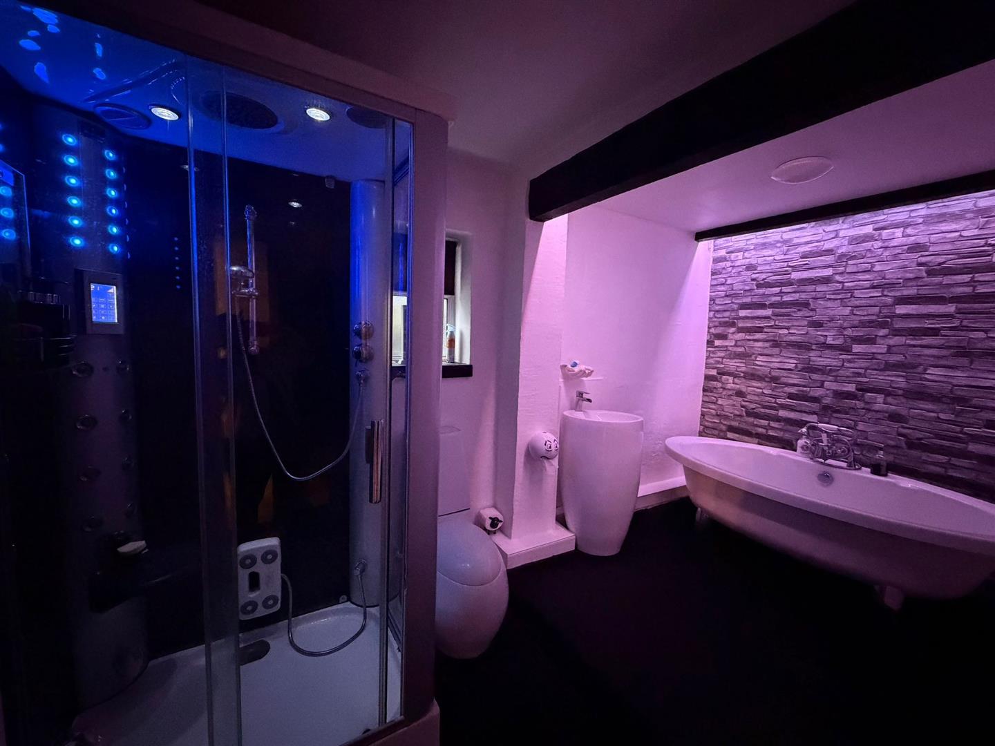 The beautifully appointed bathroom comprises a free standing oval bath with central mixer tap and showerhead attachment, modern free standing wash hand basin with mixer tap over, low level WC., shower cubicle with jacuzzi jets and jacuzzi steam feature, a window to the side aspect and recessed lighting and feature down lighting, heated towel rail and stone effect feature walls.