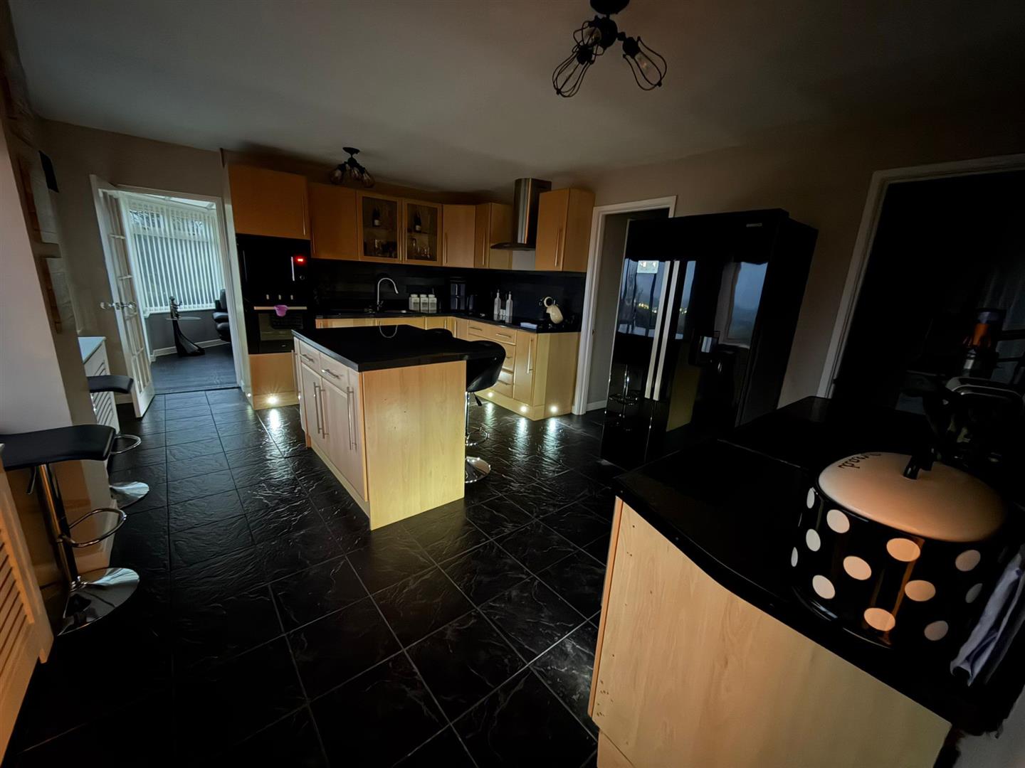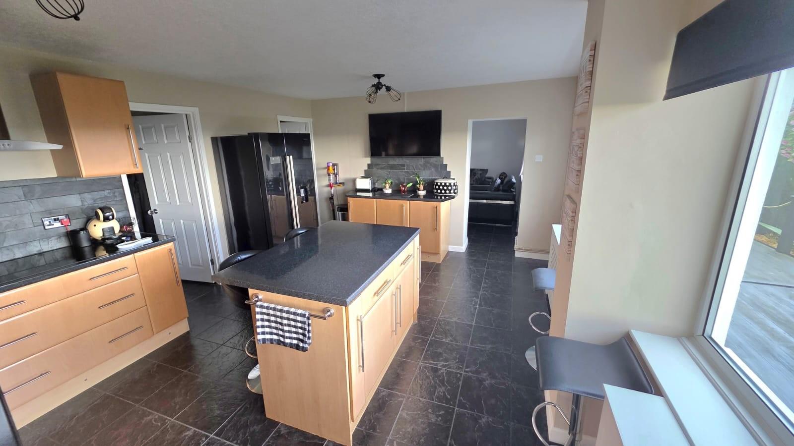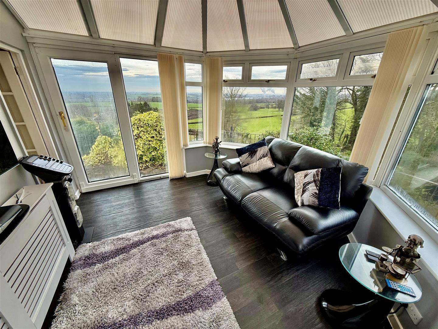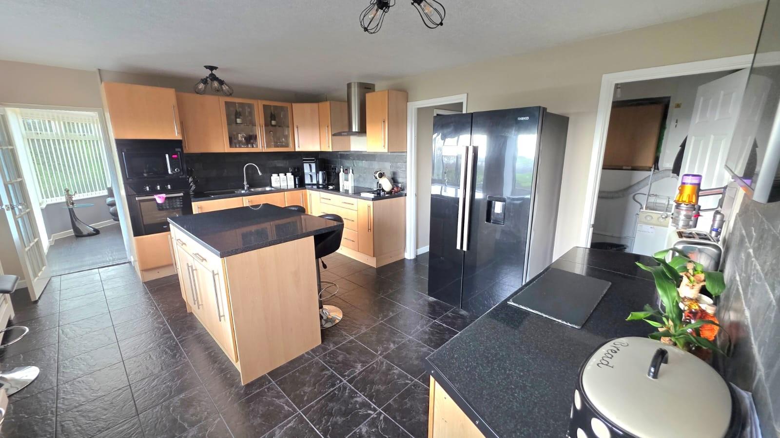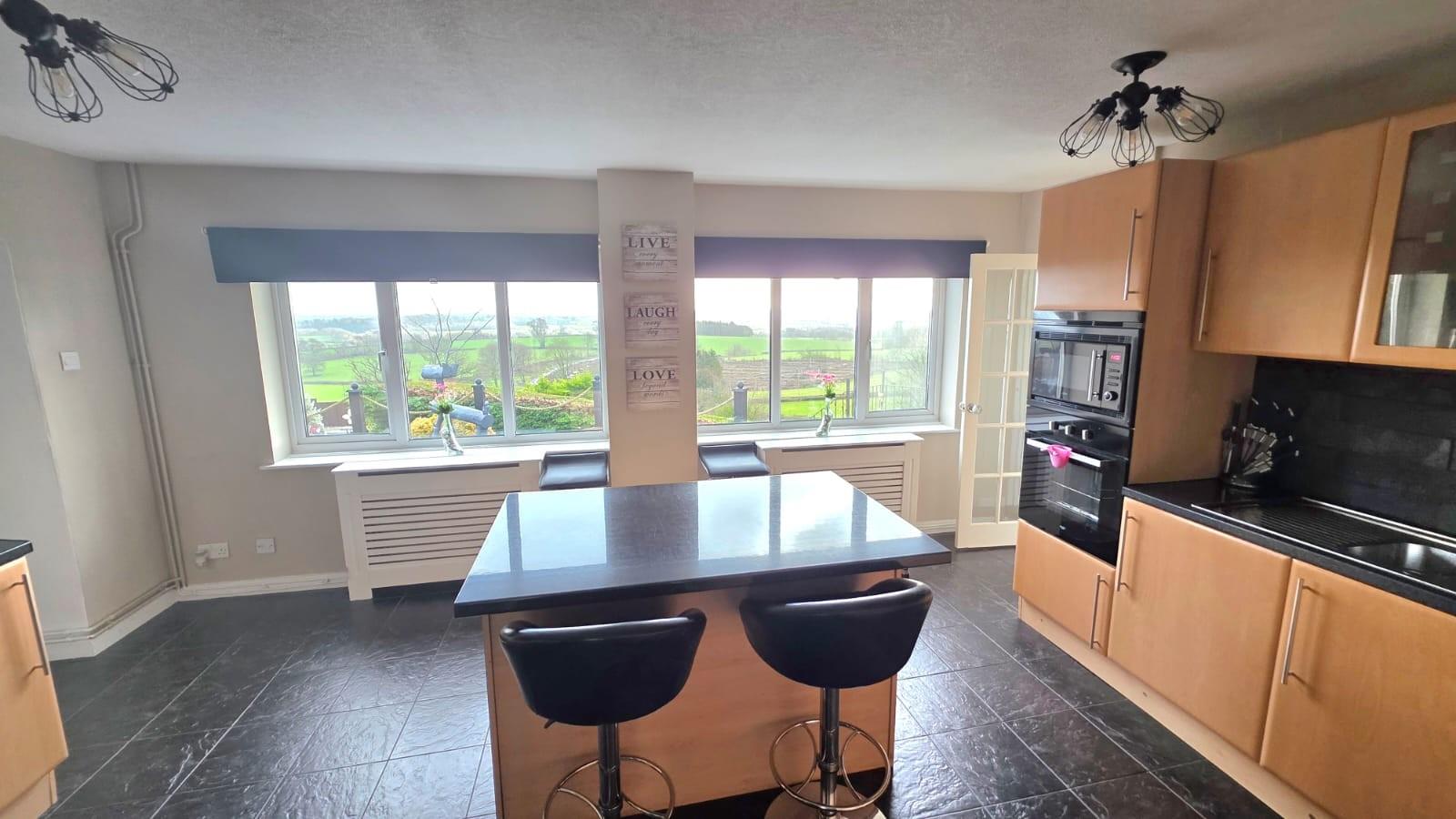 The impressive kitchen/ breakfast room comprises a range of base and wall mounted units in light beach with worktop over and tiled splash back, breakfast bar and a central island. Eye level electric oven, induction hob with chimney style extractor fan and integral microwave, 1 1/2 stainless steel sink and drainer with mixer tap over, tiled flooring, two radiators and freestanding American fridge freezer (included). Two windows to the front take in the magnificent views over the surrounding countryside. Doors lead to the lobby and utility and an archway leads through to the conservatory.