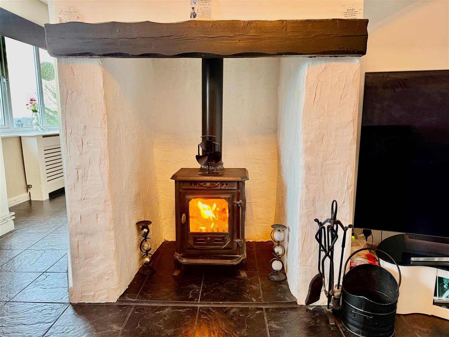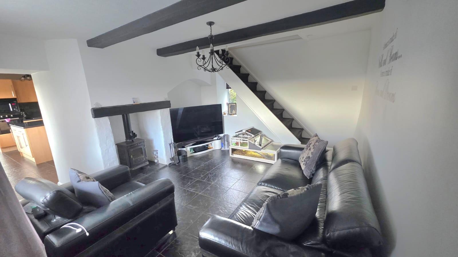 This cozy room has a window to the front benefiting from a deep window sill overlooking the amazing countryside, radiator, tiled floor throughout and stairs leading to the first floor. There is a feature log burning stove with a beam over, window to the rear and beams to the ceiling. An archway leads through to the kitchen.