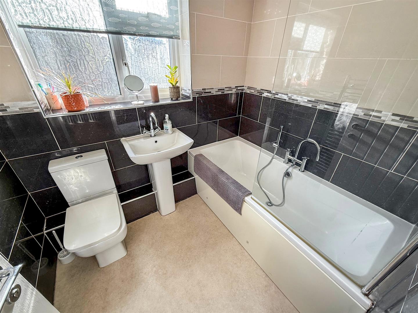 The bathroom has a panelled bath with central mixer tap and shower head, Triton electric shower and a glass screen. A wash hand basin with mixer tap over, a w/c, a heated towel rail, a window to the rear, fully tiled walls, vinyl floor and a shaver point.
