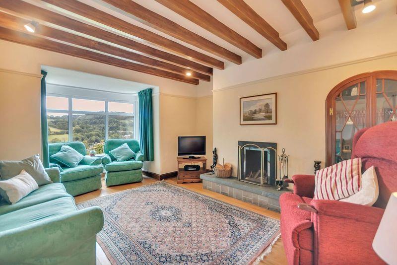 The bright lounge has a square bay window to the front with stunning far reaching views over the Ceiriog Valley and the hills beyond, oak flooring, a beamed ceiling, a radiator, an open fireplace with tiled heath and an arched display cabinet with beautiful glazed doors.