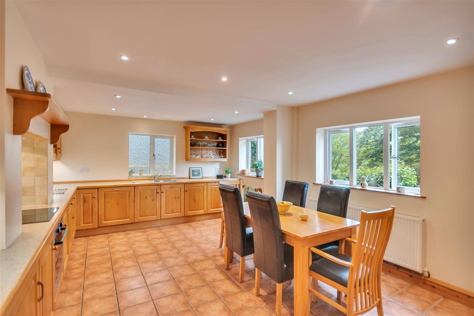 The impressive kitchen/ breakfast room is the real heart of this lovely home and has two windows to the front with superb views across the valley and beyond, a window to the side, a good range of fitted base and wall units with work surfaces over, Bosch electric oven, ceramic hob with an integrated extractor fan and oak mantle over, stainless steel sink with mixer tap, under unit lighting, integral dishwasher, tiled flooring, spotlighting and a radiator.