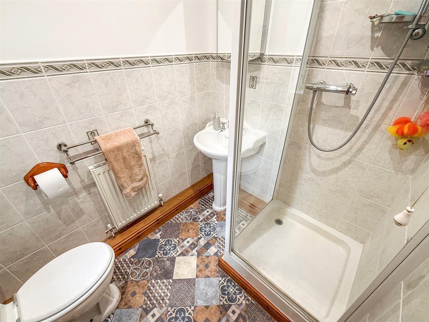 Having a shower cubicle with mains shower attachment, low level W/C, wash hand basin, part tiled walls and a window to the side. Vinyl flooring, radiator and extractor fan, coved ceiling.