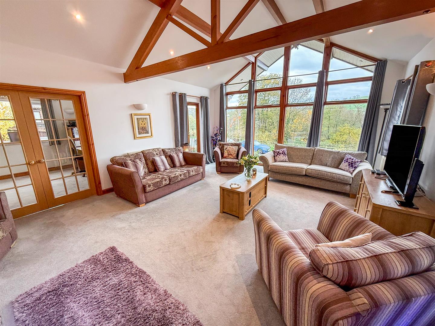The impressive, spacious lounge is filled with light and takes in the far reaching views to the front having a full-length window looking over the countryside. There is a feature central brick fireplace with an inset oil-fired log burner style fire with a hearth and oak beam, wall lighting, exposed structural beams to the ceiling, radiator and double doors leading through to the dining room.Spotlights to the ceiling. Double doors open onto a sunny balcony and outside seating area.