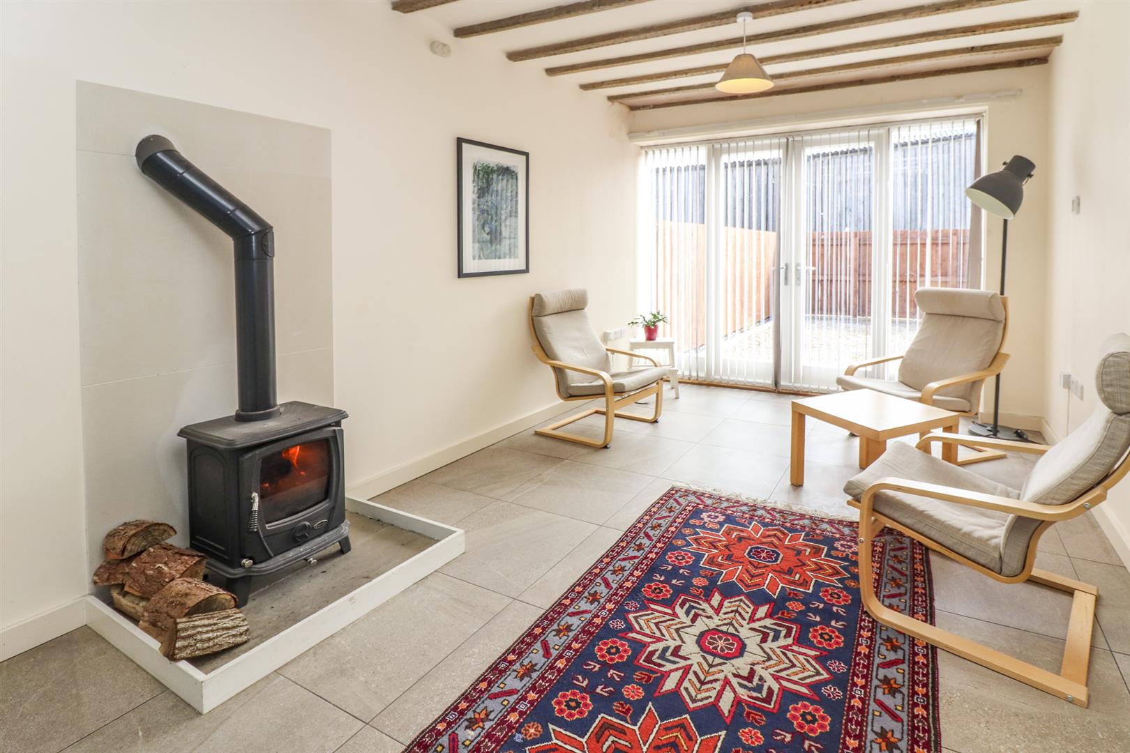 The good sized, bright lounge has floor to ceiling doors and side panels to the front, a window to the side, tiled floor with under floor heating, Stanley Log burning stove, tv point and the original beamed ceiling.