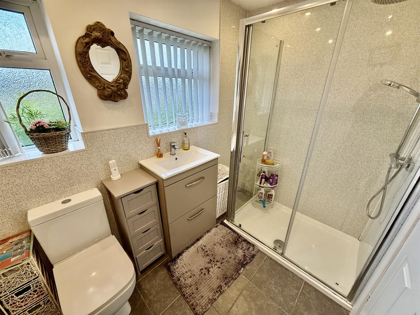 The shower room comprises a double shower cubicle with two shower heads, WC and wash hand basin on a vanity unit with a mixer tap over, aqua panelling to the walls and tiled floor, radiator and spotlights to the ceiling. Spotlights to the ceiling and two frosted windows to the rear of the property.