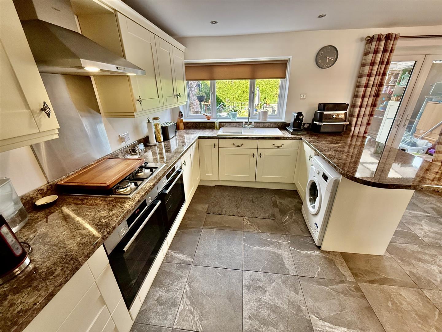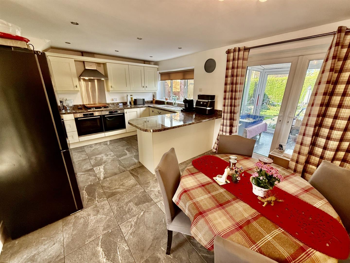 The Kitchen/dining room comprises a range of base and wall mounted units with worktop and upstands over, 1 1/2 bowl ceramic sink and drainer with mixer tap over, two electric ovens, chimney style extractor fan, stainless steel splash back, breakfast bar, space for an American fridge, integrated dishwasher, spotlighting, tiled flooring and a radiator. An archway leads through to the lounge and French doors provide access to the conservatory.